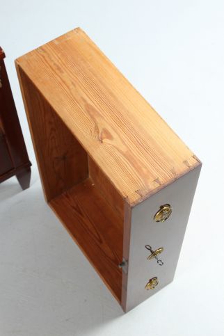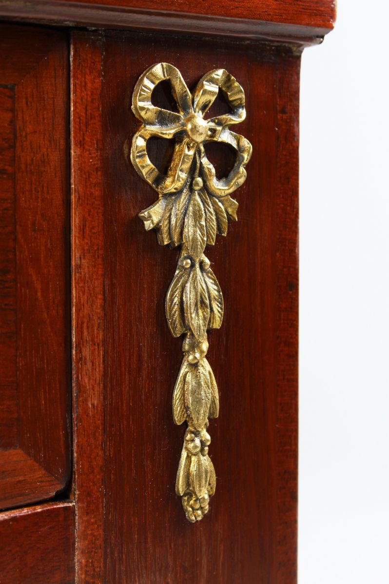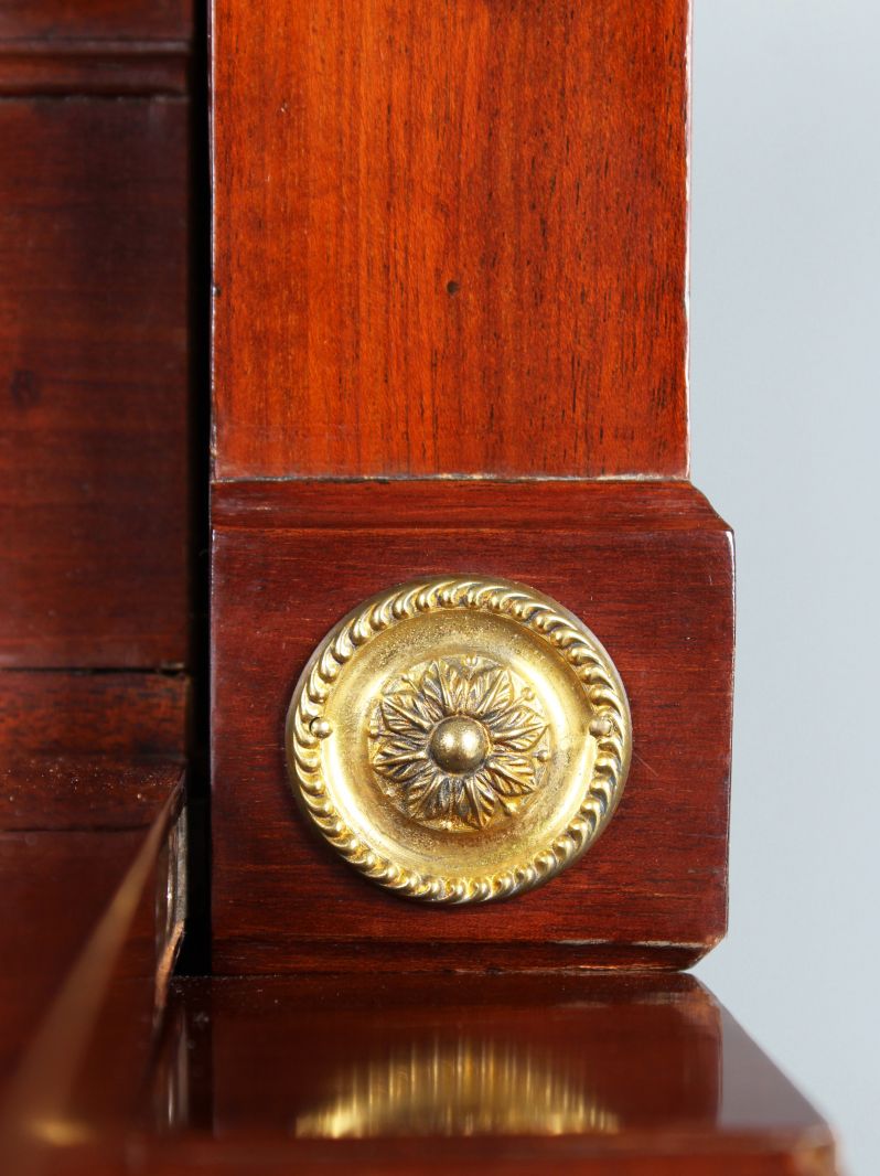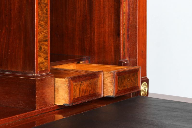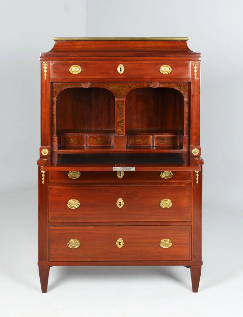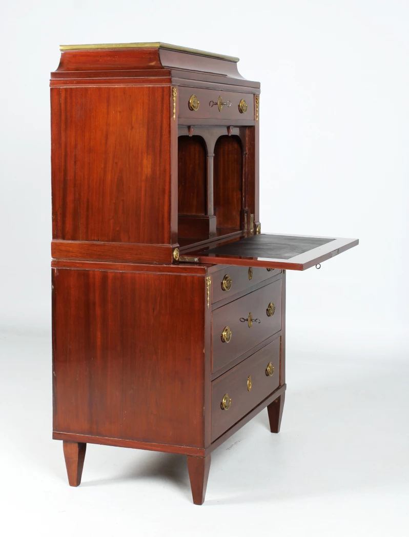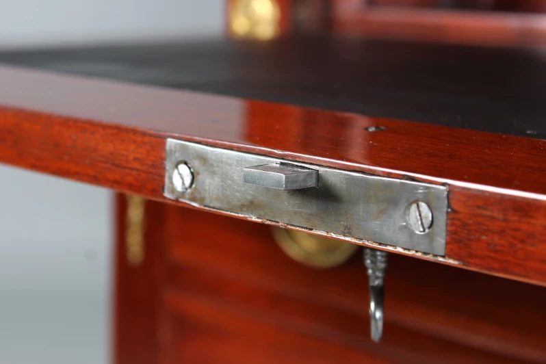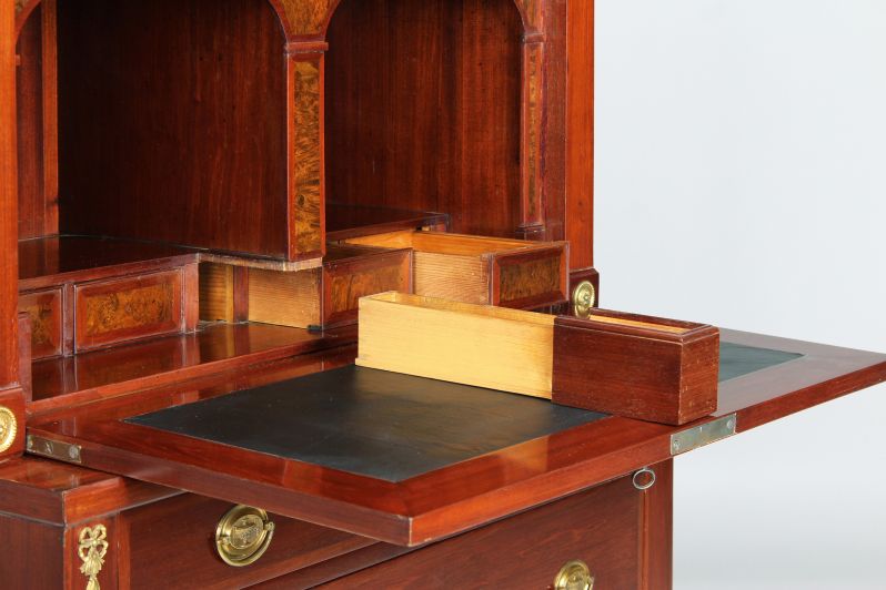 Au-dessus de l'abattant de l'écritoire se trouve un autre grand tiroir, suivi d'un élément supérieur en forme de pagode qui abrite un tiroir également travaillé en tant que compartiment secret, qui sort en appuyant sur un mécanisme de déclenchement caché. Un profilé recouvert de laiton constitue l'extrémité supérieure. La quincaillerie dorée, composée de poignées de tirage, de rosaces et de guirlandes de feuilles avec nœuds, est en partie coulée en laiton, en partie estampée en tôle de laiton.