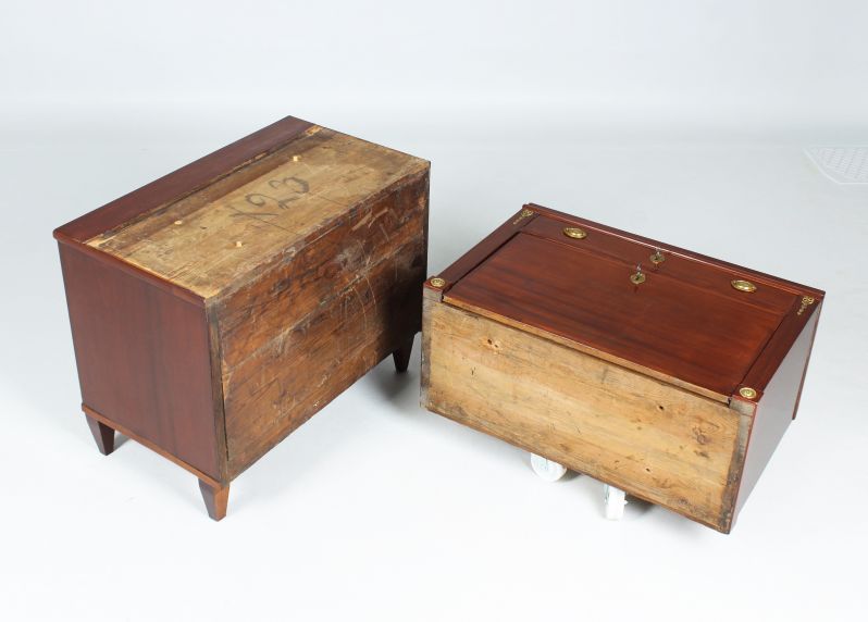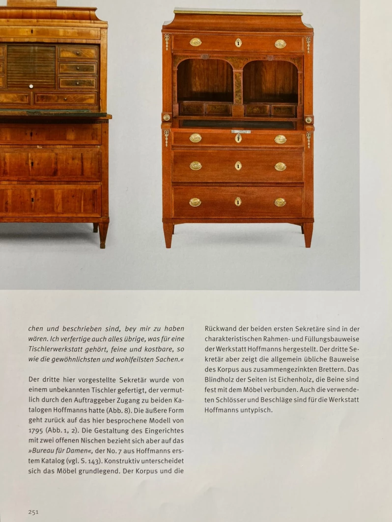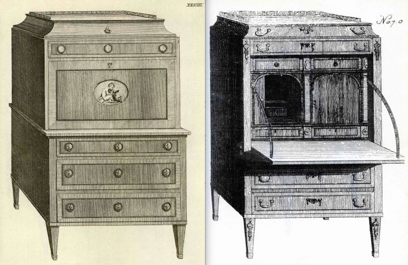 L'ébéniste exécutant a manifestement utilisé deux modèles différents tirés des catalogues d'Hoffmann. Il s'est inspiré du secrétaire publié en 1795 à la planche XXVIII pour le corps en deux parties et la partie supérieure en retrait, et du secrétaire à deux niches publié en 1789 à la planche n° 10 pour le corps en deux parties et la partie supérieure en retrait.