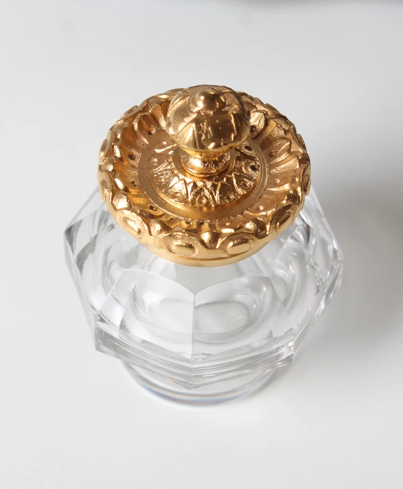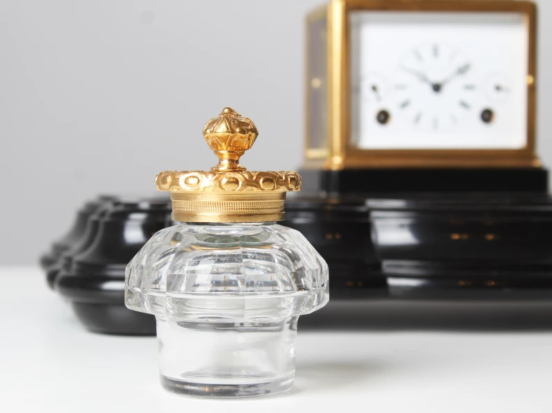 Derrière, à gauche et à droite, se trouvent deux récipients en verre cristallin pour l'encre et le sable.