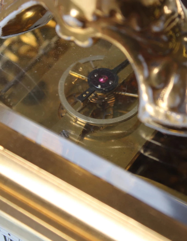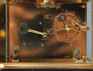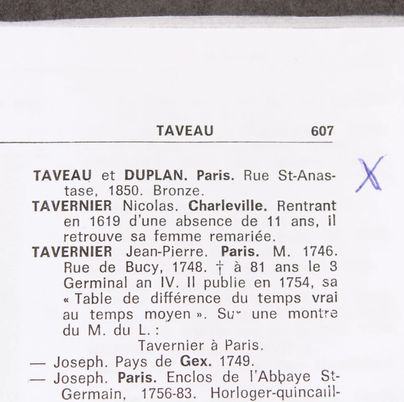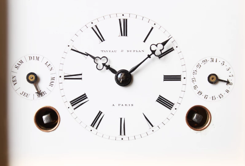 Le cadran est signé : Taveau & Duplan a Paris. À côté du cadran principal, nous voyons deux cadrans auxiliaires pour la date et le jour de la semaine. En dessous se trouvent les carrés de remontage pour les mouvements de marche et de sonnerie.