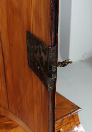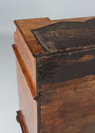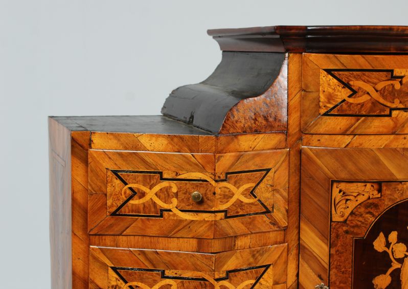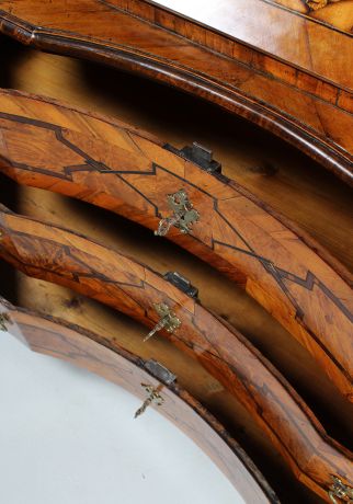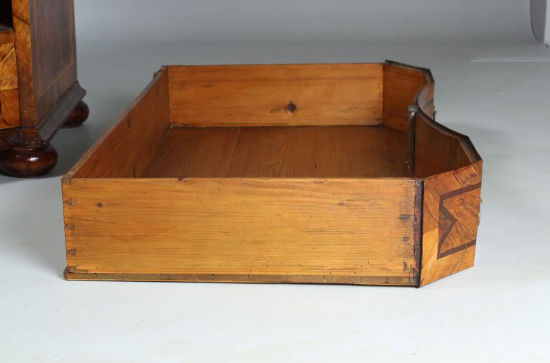 La base à trois cuvettes repose sur des pieds sphériques pressés. La façade est pliée à plusieurs reprises et incurvée de manière concave vers l'intérieur. Les façades des tiroirs sont plaquées en noyer en diagonale dans la partie extérieure, les marqueteries de rubanerie sont réalisées en prunier et en chêne des marais.