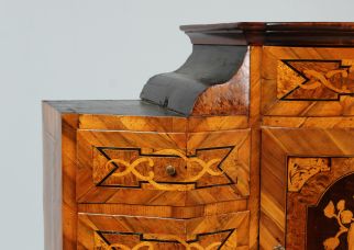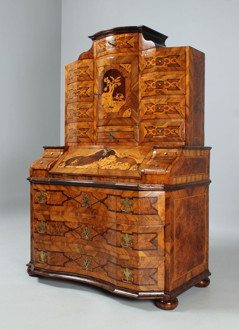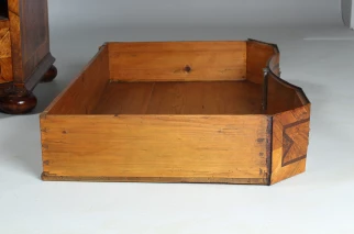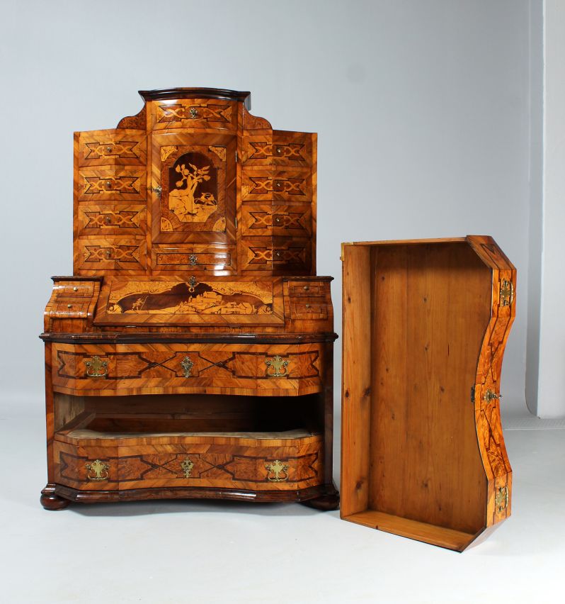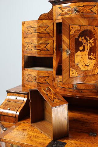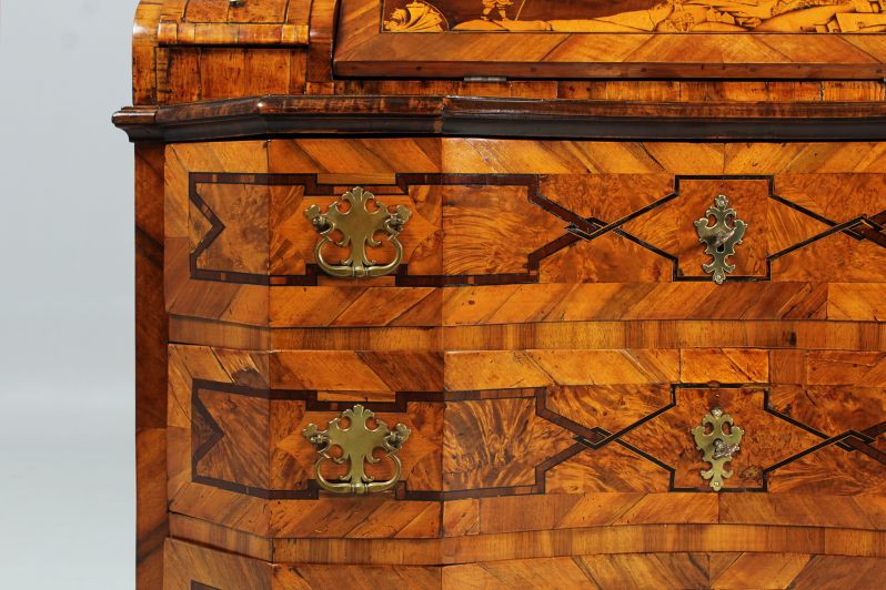 La partie centrale du meuble comporte deux petits tiroirs superposés à l'extérieur et, au centre, la tablette écritoire qui s'ouvre vers l'avant. De l'extérieur, celle-ci est décorée d'une marqueterie complexe. Un randonneur est représenté dans un décor de campagne villageoise, entouré de cartouches. La marqueterie est exclusivement fabriquée en érable, les différentes pièces de placage sont nuancées au feu, se distinguent ainsi les unes des autres et donnent à l'image une certaine "profondeur" et un caractère tridimensionnel.