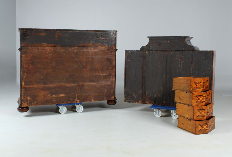 La partie supérieure de l'écritoire se compose de la porte tabernacle centrale, entourée de dix autres tiroirs.