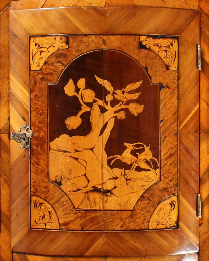 La porte du tabernacle est plaquée en diagonale à l'extérieur en prune et nous voyons ici aussi une marqueterie figurative en érable encadrée à la manière d'un cartouche sur un fond de bois sombre.
