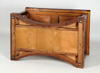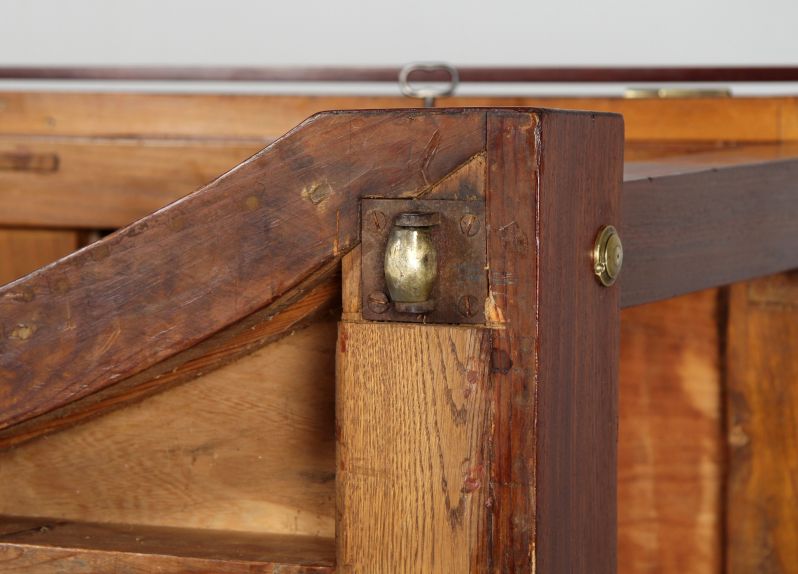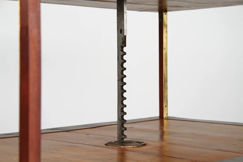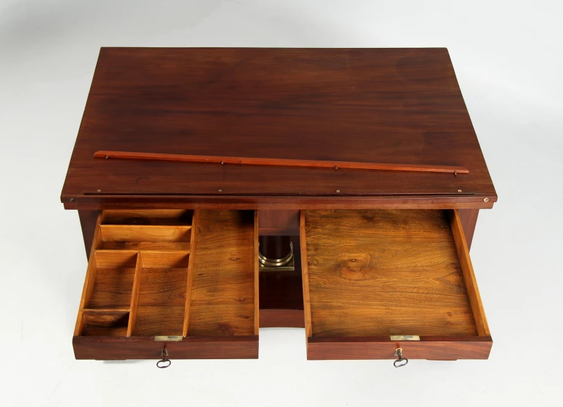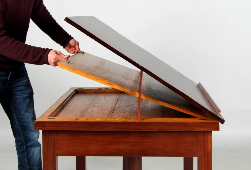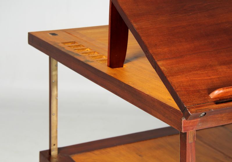 L'inclinaison du plan de travail est réglable et un rebord amovible empêche les livres et les dessins de glisser. Quatre supports extensibles sur le bord du plateau ainsi qu'une baguette montée à distance à l'avant devaient servir à fixer les dessins plus grands. Depuis l'arrière de la table, un autre grand compartiment peut être ouvert pour ranger des dossiers de dessin.