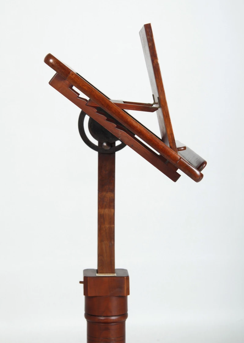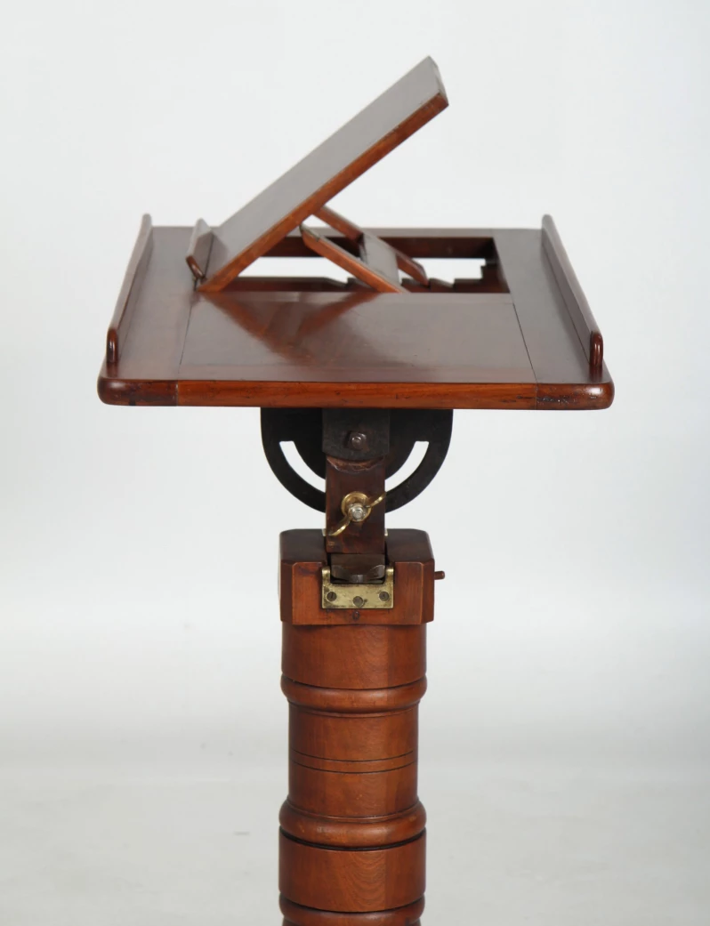 Table de lecture en noyer massif, réglable en hauteur et en inclinaison.