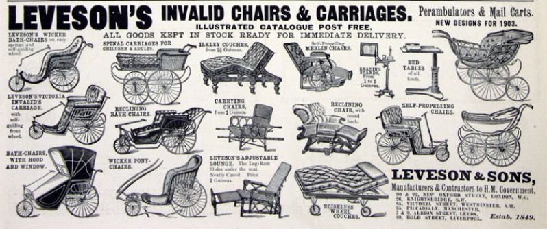 La société Leveson & Sons, fondée en 1849, s'est spécialisée au cours du 19e siècle dans la fabrication de meubles à réglage mécanique ainsi que dans la fabrication de fauteuils roulants et de chaises longues à usage médical et domestique.