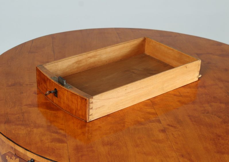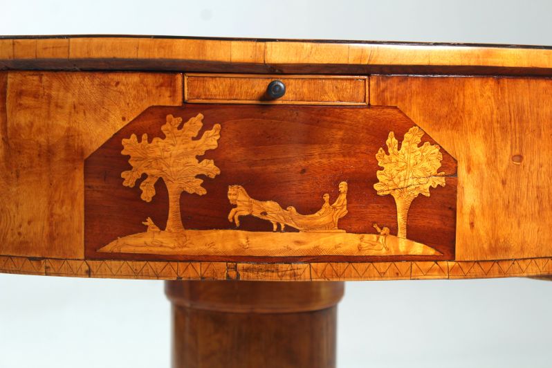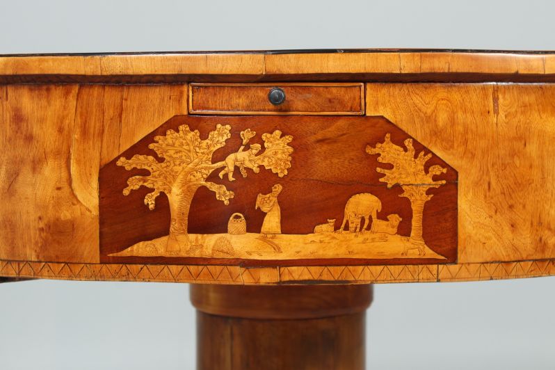 Sous chacun de ces petits tiroirs se trouve une zone de marketing. Sur un fond d'acajou, nous voyons ici des scènes rurales finement gravées et incrustées dans l'érable :