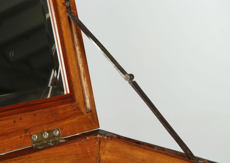 Le plateau s'ouvre et se bloque à l'aide d'une charnière en fer. Un grand miroir à facettes est monté sur la face intérieure. Lorsque le plateau est ouvert, la hauteur totale est de 123 cm.
