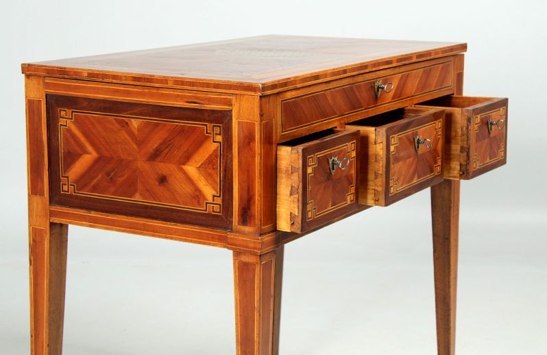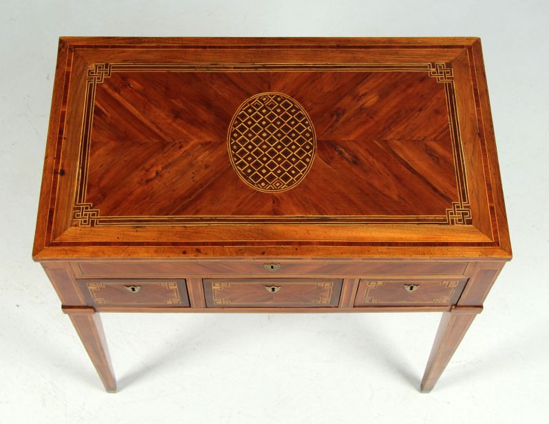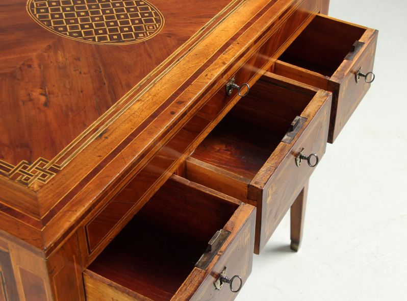 La marqueterie sur le plateau supérieur du meuble est également spectaculaire. Les travaux de marqueterie sont ici réalisés de manière encore plus élaborée et forment ainsi le cadre parfait pour le parquet central dans le médaillon ovale.