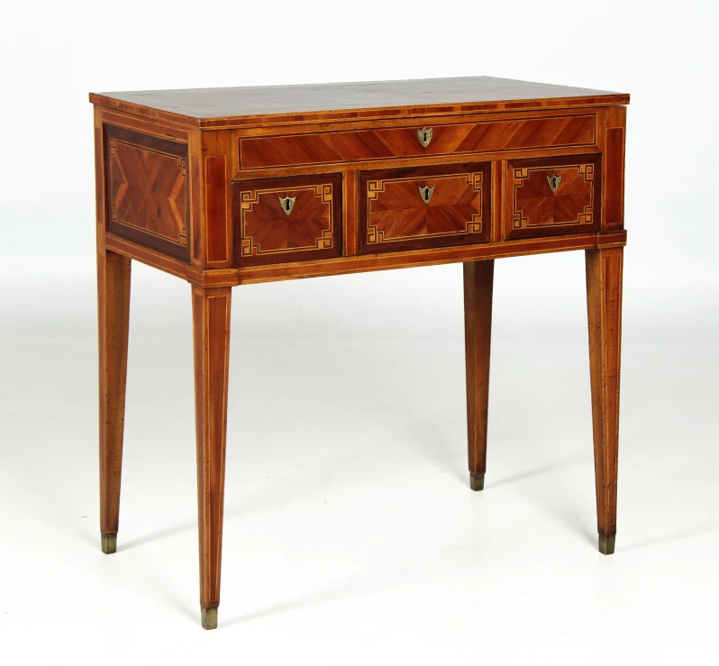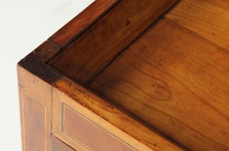 Le cadre haut du meuble accueille à l'avant trois tiroirs dont les façades sont encadrées de bois d'acajou sombre. Entourées de rubans géométriques sombres sur fond clair, les surfaces sont placées en diagonale les unes par rapport aux autres en bois de prunier. La même conception se retrouve sur les côtés du meuble.