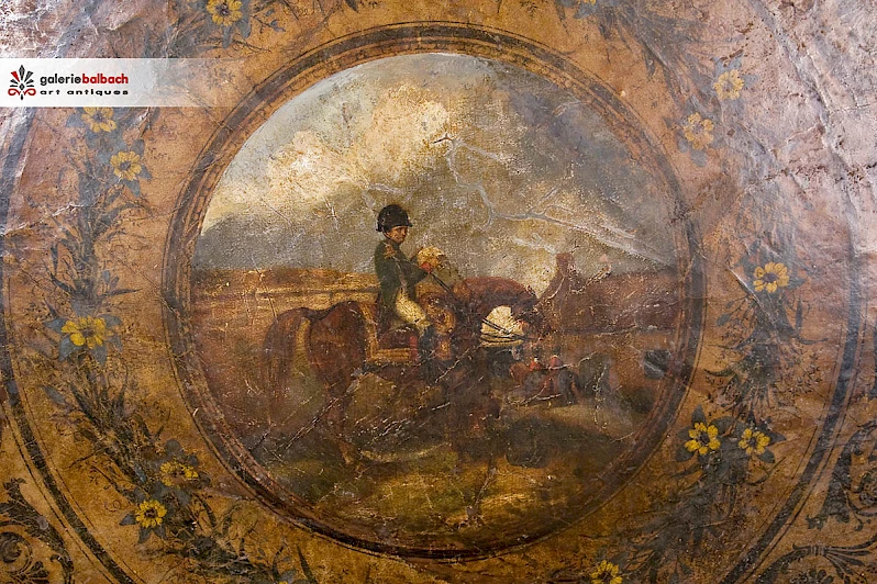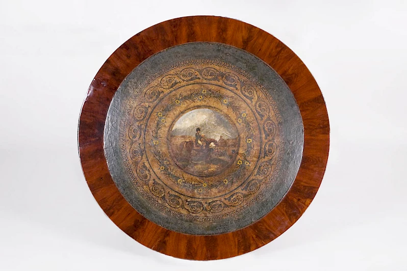 Peinture à l'huile sur toile grossière intégrée dans le plateau.