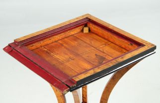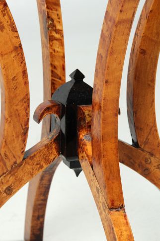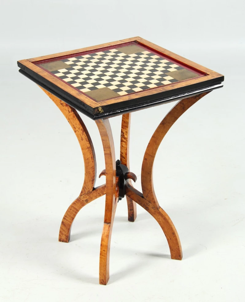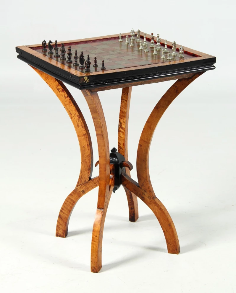 Table de jeu en bouleau massif posée sur un support à quatre pieds en forme d'arc double.