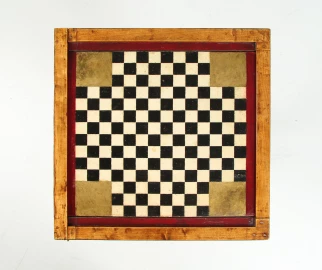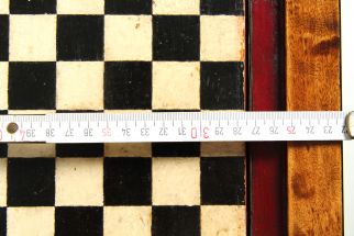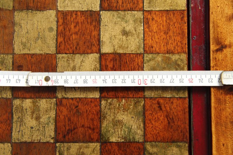 Si nous retournons le plateau de jeu, nous voyons un autre champ de jeu avec des cases plus nombreuses et plus petites. Comme ce côté du plateau de jeu semble avoir été le plus souvent tourné vers le bas et donc moins exposé aux influences environnementales telles que la lumière et l'humidité, les couleurs sont ici presque d'origine. Ici, nous voyons le ton doré riche, comme il l'était probablement aussi à l'origine sur l'autre côté.