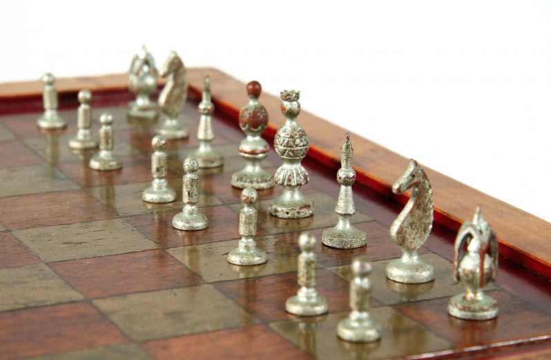 Le plateau d'échecs est composé d'une alternance de cases en acajou et de cases dorées. L'or a pâli et s'est terni au fil des décennies.