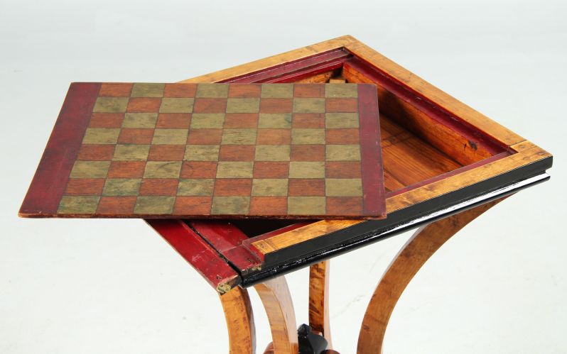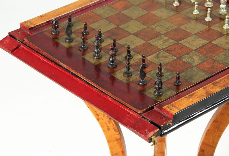 Les pions sont certainement d'origine et appartiennent à la table. Si nous comparons la tour avec l'élément central de la sous-construction de la table, nous constatons que le design parle ici un seul et même langage.