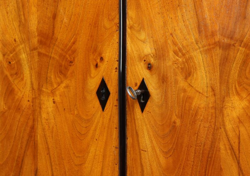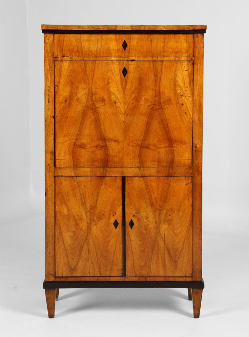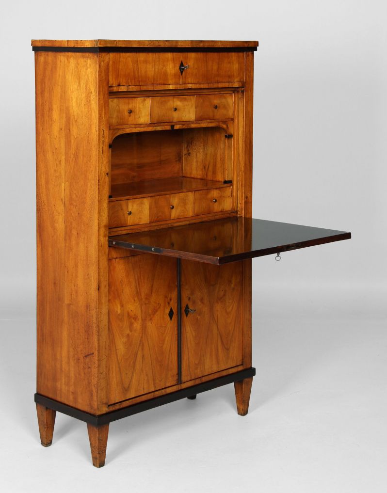 Meuble restauré en conservant sa patine. L'ancien vernis à la gomme-laque d'origine a pu être conservé et rafraîchi. Les traces d'utilisation et d'usage ont été délibérément conservées lors de la conservation et confèrent au secrétaire un caractère unique et très authentique.