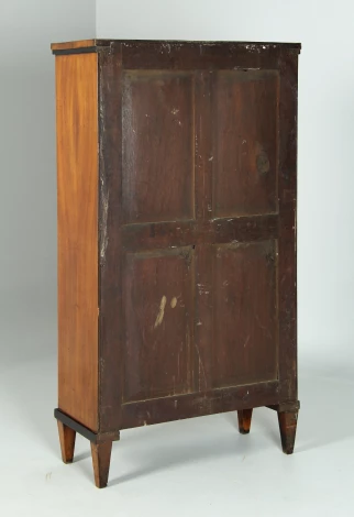 L'intérieur derrière la porte d'écriture se compose d'un grand compartiment ouvert avec un arc en plein cintre soutenu par des pilastres. Au-dessus et en dessous se trouvent trois petits tiroirs en ligne.