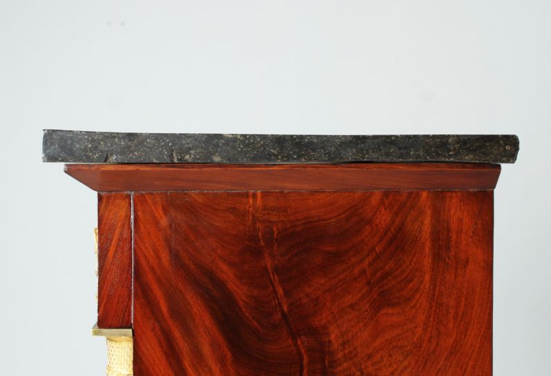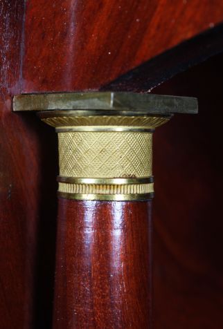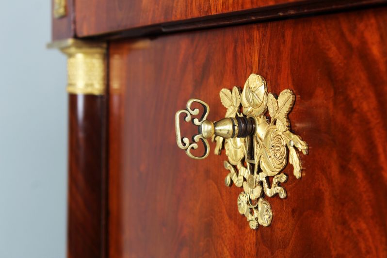 Les côtés du secrétaire sont plaqués d'un large bois d'acajou merveilleusement veiné.
