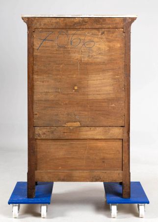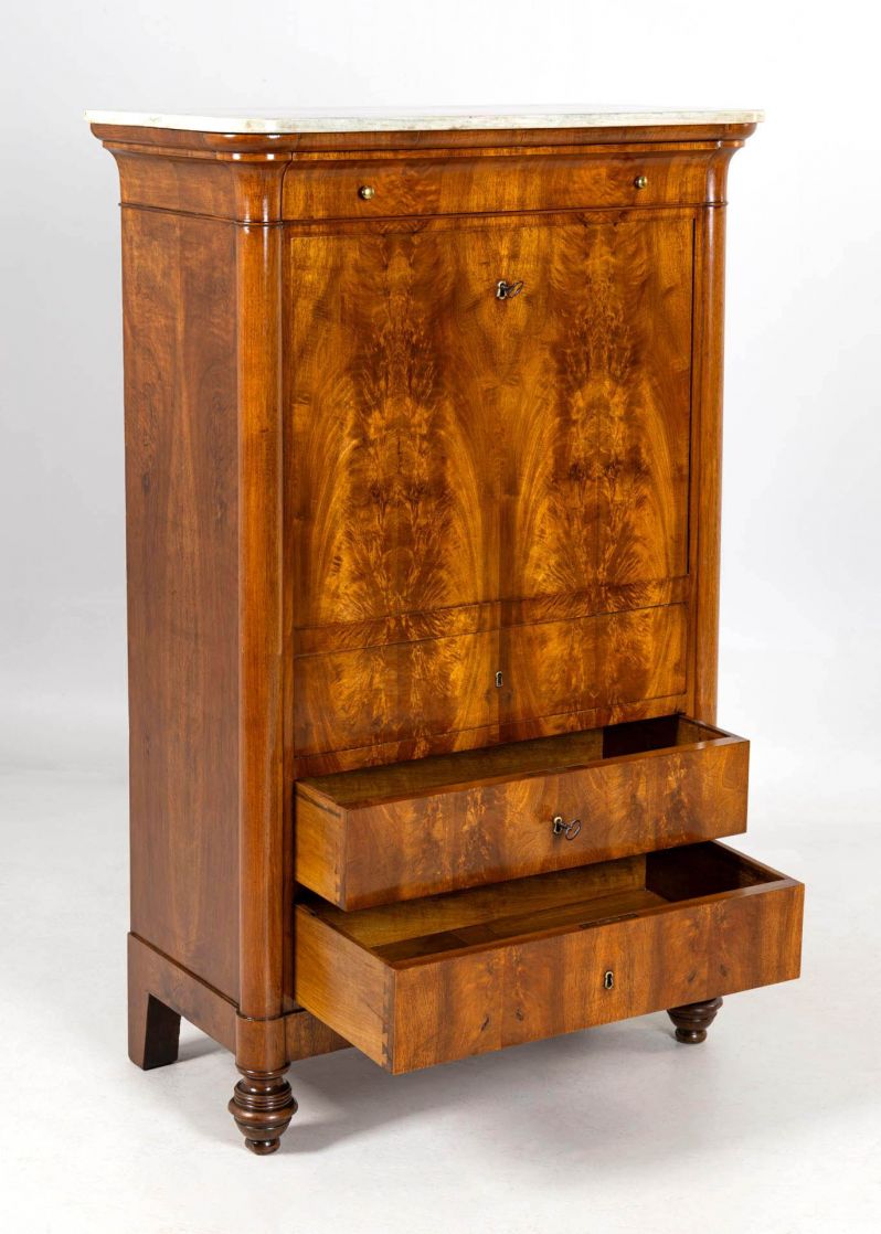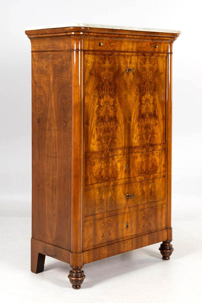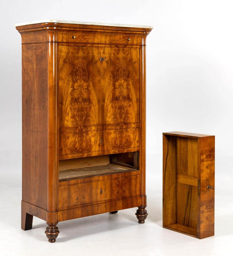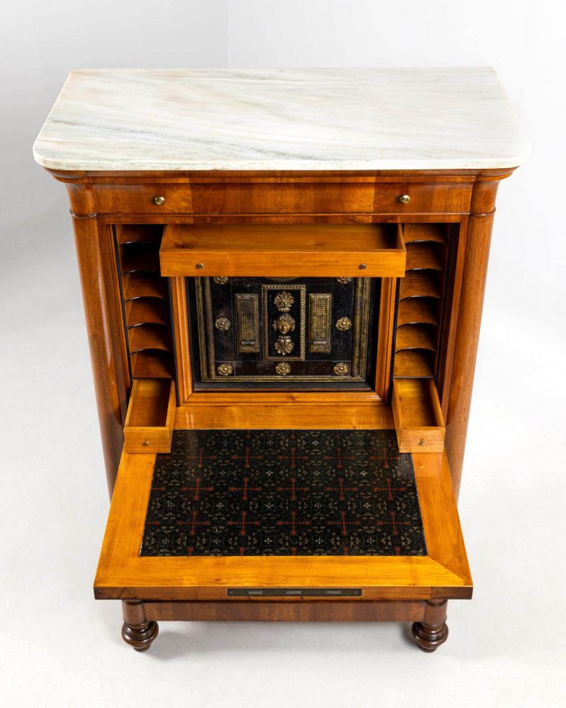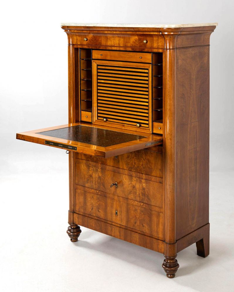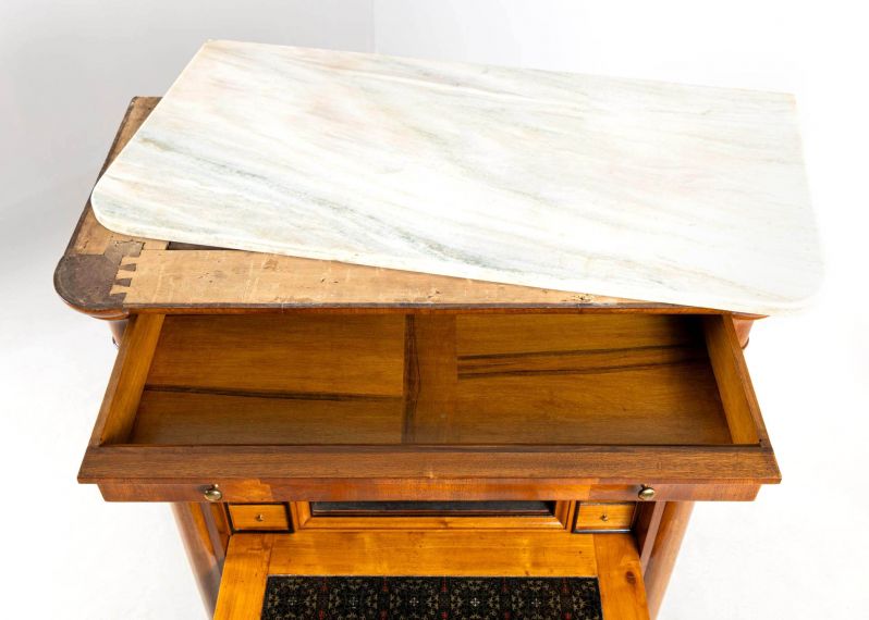 La façade se compose de deux vrais et d'un faux tiroirs en bas, de la porte d'écriture située au-dessus et d'un tiroir de tête bombé sous la plaque de recouvrement en marbre blanc de Carrare posée librement.
