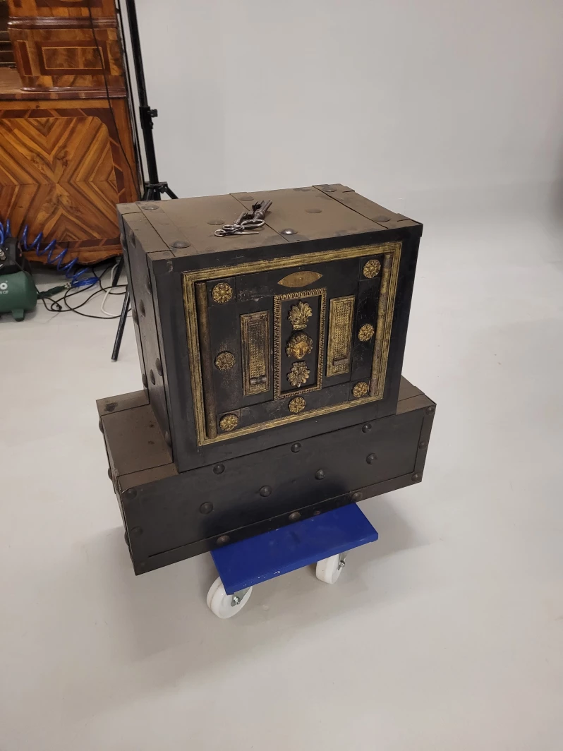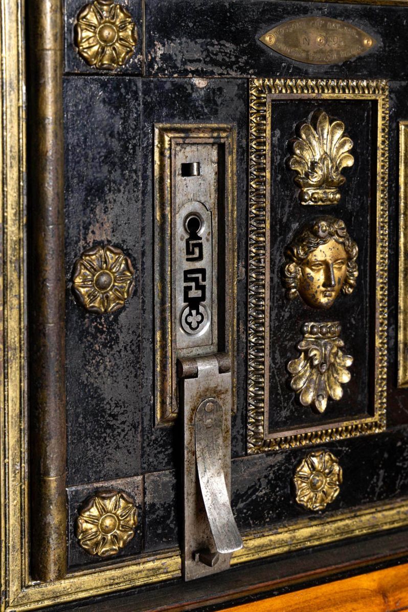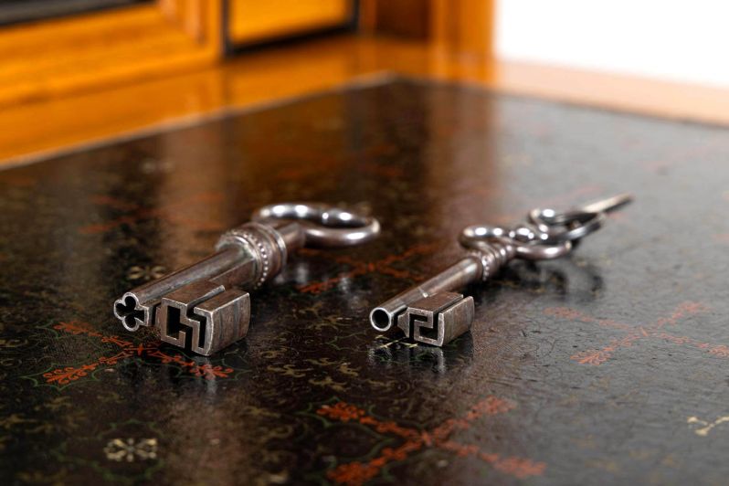 Sur le côté du mascaron encadré se trouvent deux caches, dont celui de gauche s'ouvre au moyen d'un déclencheur secret et laisse apparaître deux trous de serrure au design élaboré. Les deux clés, dont l'une est dotée d'une tige en forme de trèfle, sont incroyablement bien ajustées. Vous verrez mieux ce détail dans la vidéo ci-jointe.