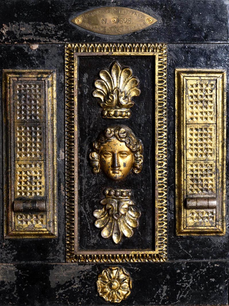 L'intérieur se présente avec une grande fermeture à enroulement, trois tiroirs et 12 compartiments à lettres ouverts. Le volet roulant coulisse vers le haut et laisse apparaître un solide coffre-fort en fer, fabriqué par Mossone Gio Bat. Fab. à Andorno / Province de Di Biella avec le numéro de série N.525.