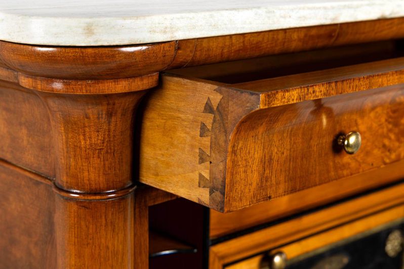 Le tiroir situé au-dessus de la partie écriture présente également une belle caractéristique de qualité. Regardez à cet effet la photo qui montre l'assemblage d'angle avant. Une telle dentelure en queue d'aronde, si bien réalisée sur le rayon, témoigne non seulement de la plus grande exigence artisanale du maître d'œuvre, mais aussi de son énorme amour du détail.