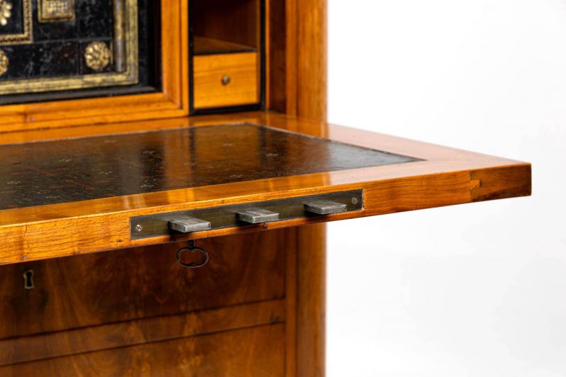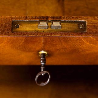 Si nous ouvrons les deux tiroirs inférieurs, nous remarquons déjà les serrures d'une qualité exceptionnelle pour un meuble à écrire de ce type, avec deux verrous et une clé au design élaboré. Si nous ouvrons complètement le tiroir supérieur, nous voyons le fond intermédiaire situé dans le corps du meuble, appelé fond à poussière - un détail que l'on ne trouve que sur peu de secrétaires de l'époque. Les assemblages d'angle des tiroirs sont proprement aboutés, les fonds des tiroirs sont divisés en deux parties avec une traverse centrale - cette finition répond également aux exigences qualitatives les plus élevées.