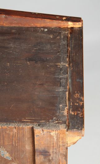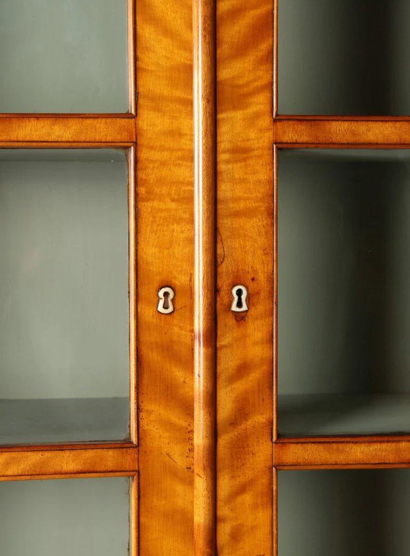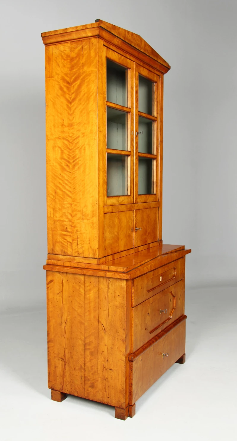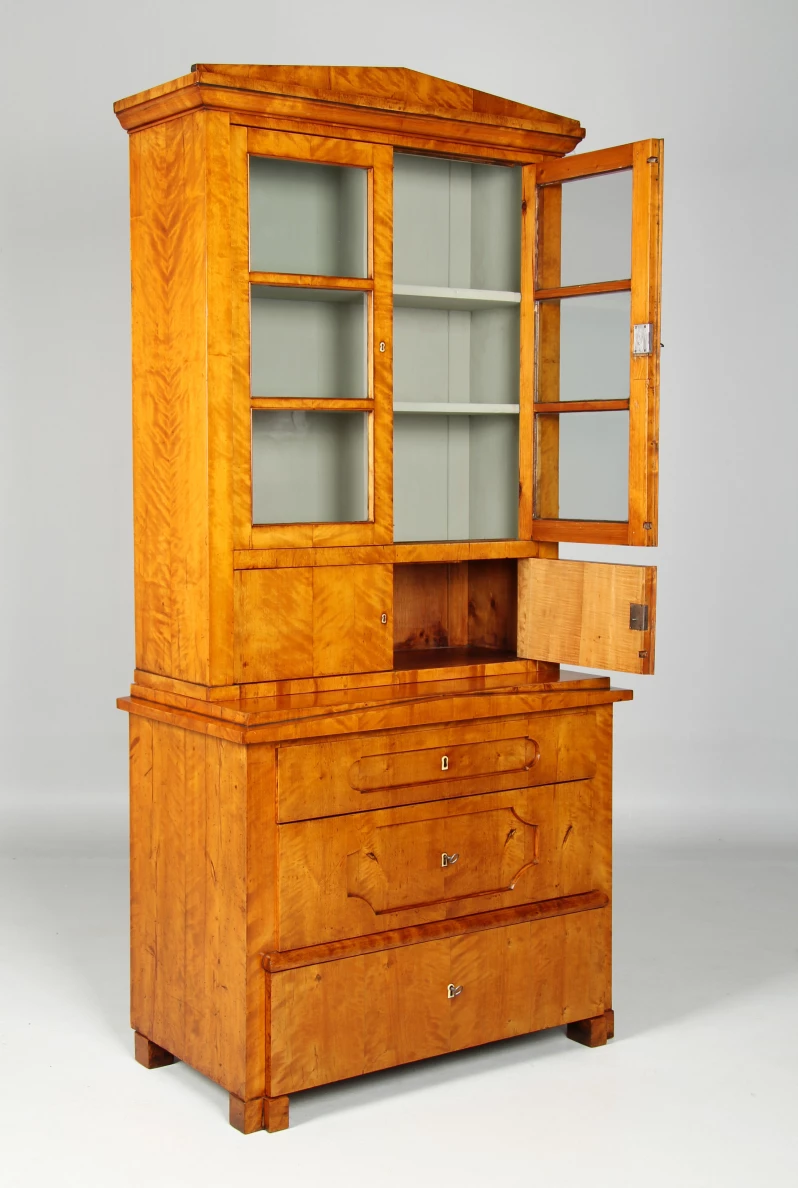 Fabriquer de grandes vitres était une affaire coûteuse à l'époque de la création du meuble. Les portes de la vitrine sont donc divisées par des croisillons en trois petites surfaces vitrées. Sur les étagères situées derrière les croisillons, on présentait des livres, de la vaisselle ou des objets en vitrine. Les anciennes vitres d'origine en verre légèrement ondulé sont encore montées.