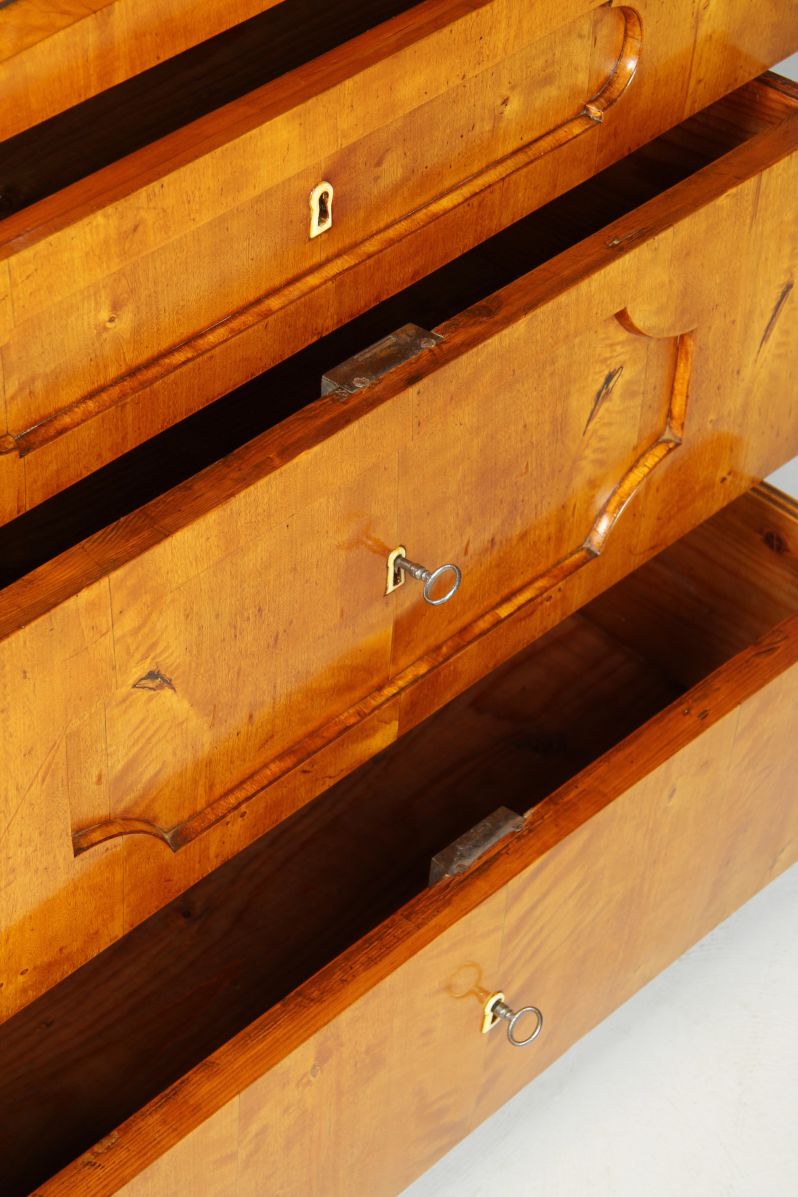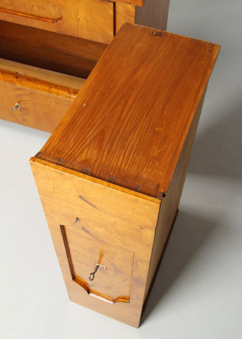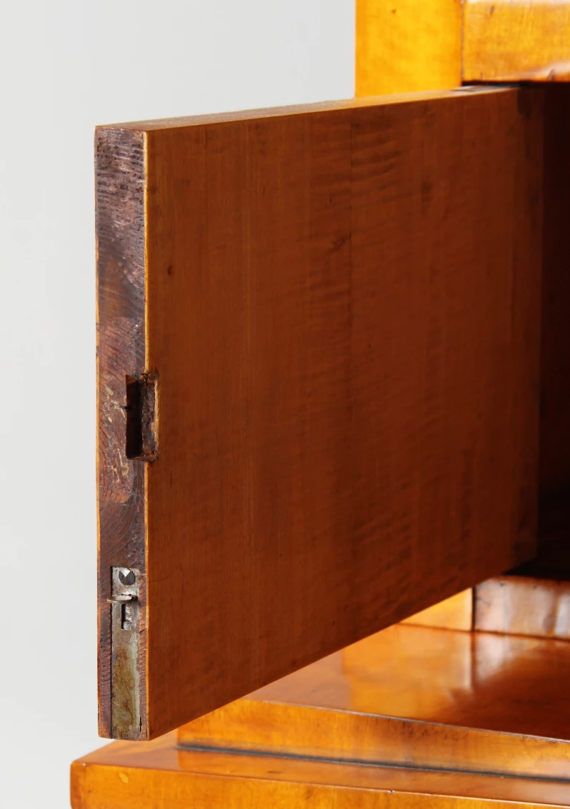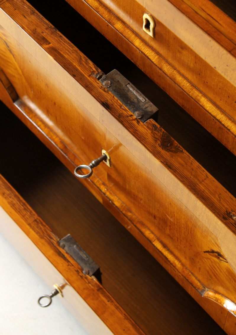 Le placage de bouleau flammé est typique du nord de l'Allemagne, tout comme la segmentation encastrée sur les façades des tiroirs et le tiroir inférieur mis en scène comme un escalier par une traverse massive. Les pieds suivent la forme de la façade du meuble. Des étiquettes en jambe discrètes accentuent les guides de clés.