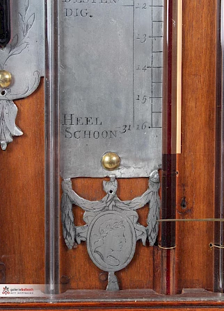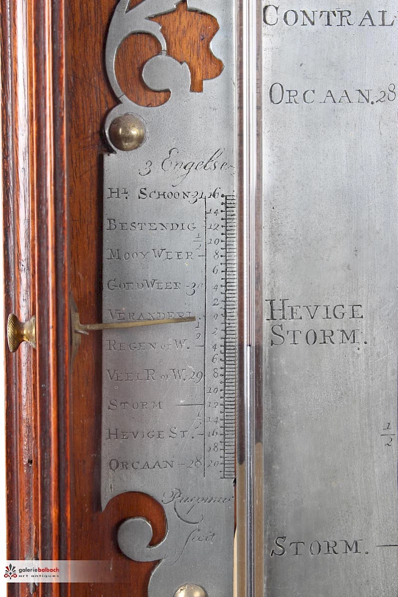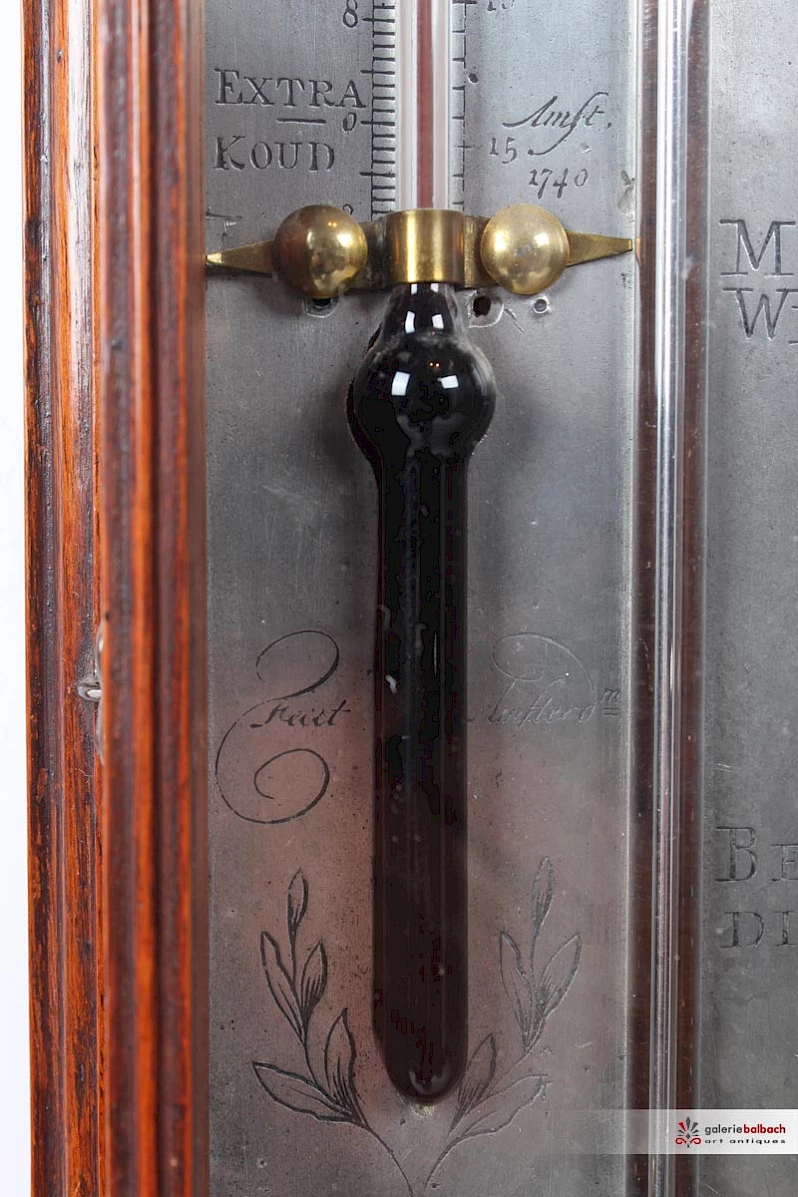 Dietro la lastra di vetro si trova la placca di peltro incisa. La temperatura e la pressione dell'aria possono essere lette dall'innalzamento e dall'abbassamento delle colonne di mercurio o di alcol nei tubi di vetro.