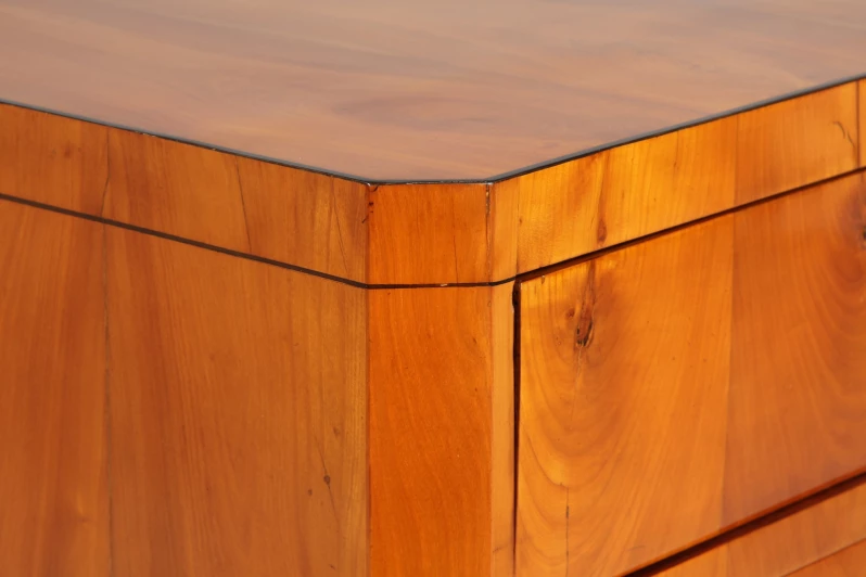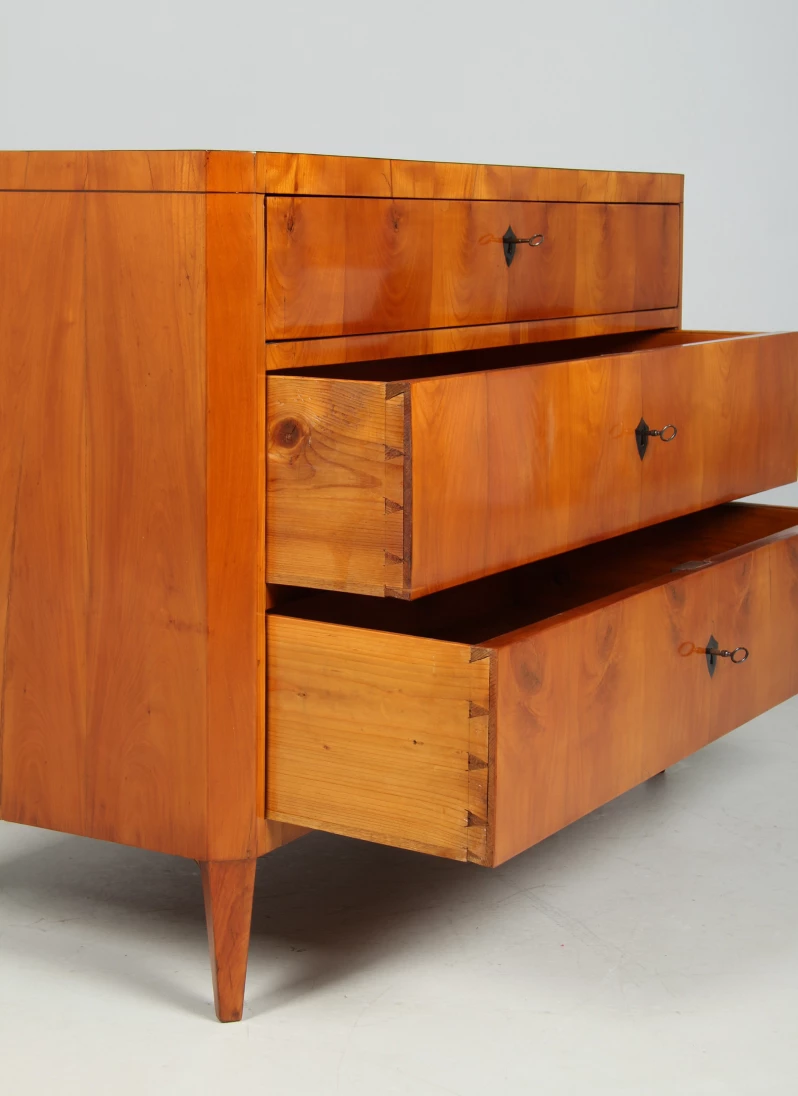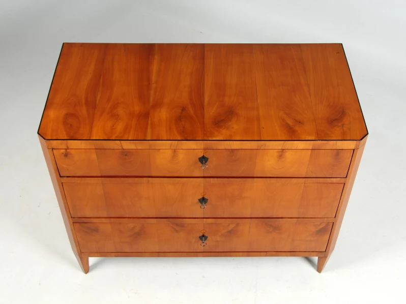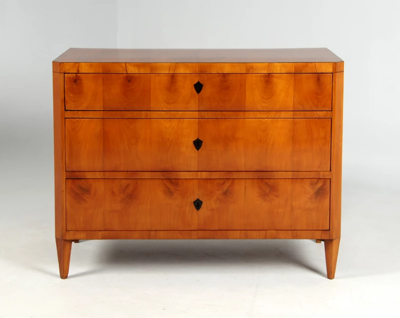 Cassettiera biedermeier su gambe appuntite nel tipico cubismo austero bavarese, senza sporgenza del pannello superiore e senza accentuazione dello zoccolo.
