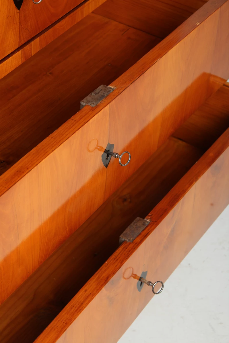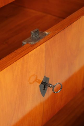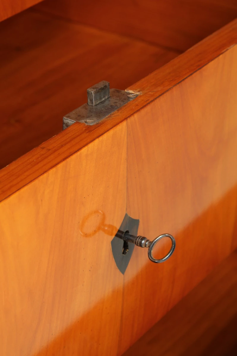 Il frontale con venature del ciliegio perfettamente speculari è composto da un totale di sei foglie di impiallacciatura tagliate una dopo l'altra dal tronco. Le placchette scure a forma di cresta creano un netto contrasto con il colore caldo del legno.