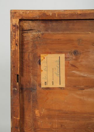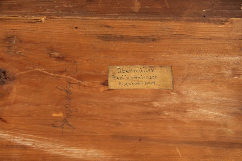 Sulla parete posteriore sono presenti anche una vecchia etichetta di trasporto e un'iscrizione del proprietario. Sebbene quest'ultima attribuisca la cassettiera a Berlino, il nome del proprietario è chiaramente bavarese, il che sottolinea ulteriormente l'origine tedesca meridionale del mobile.
