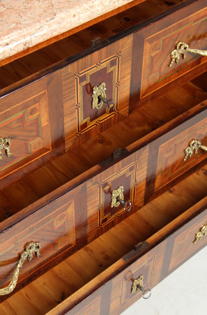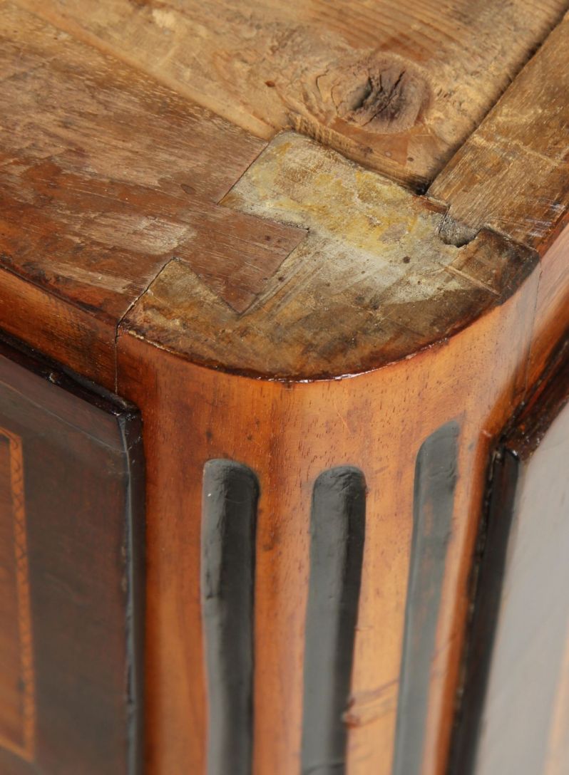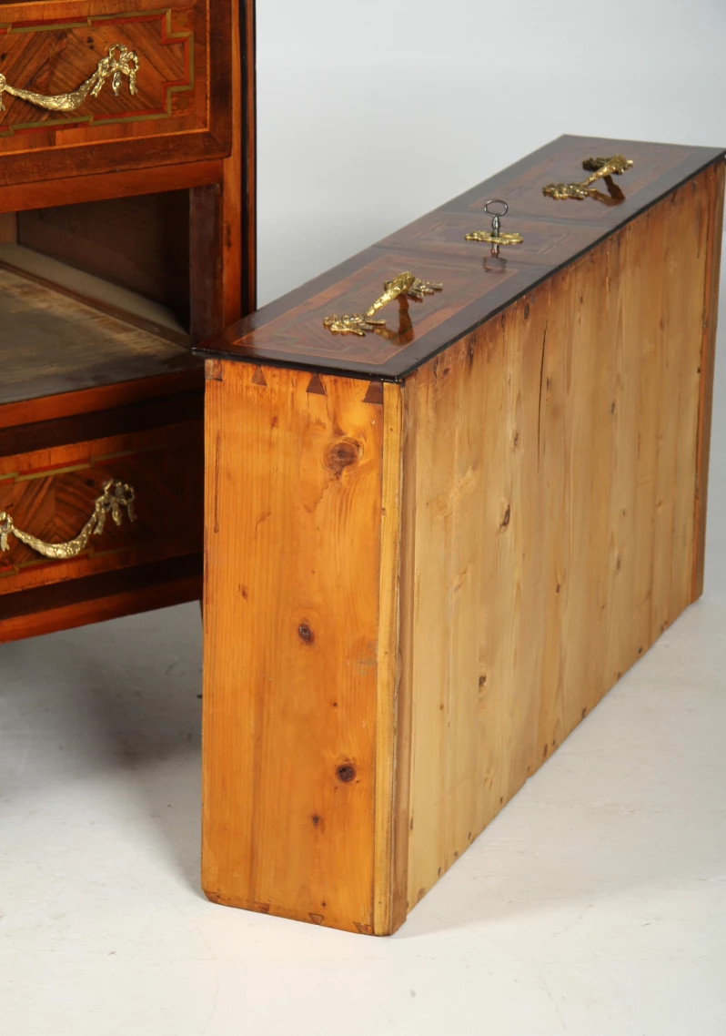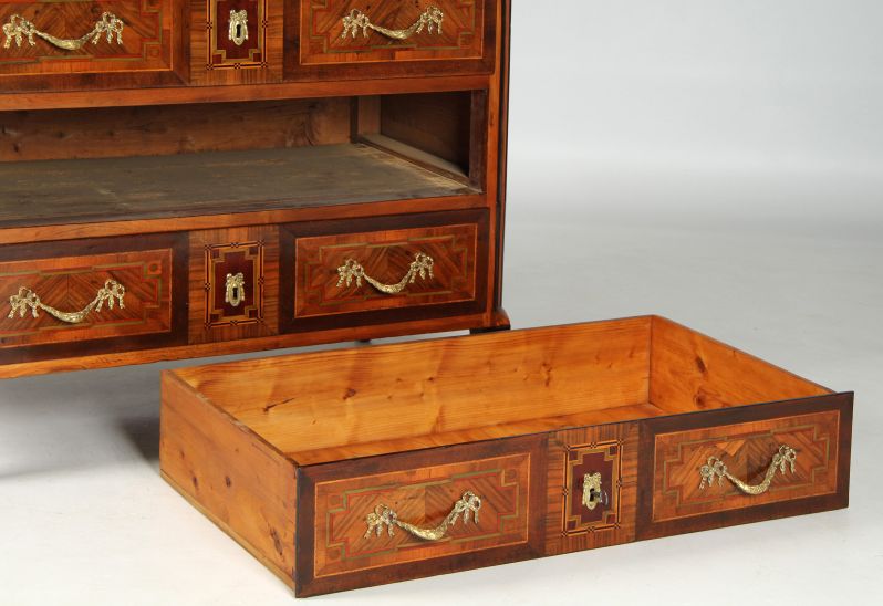 I frontali dei cassetti sono suddivisi in tre pannelli con un'elaborata tecnica di intarsio.