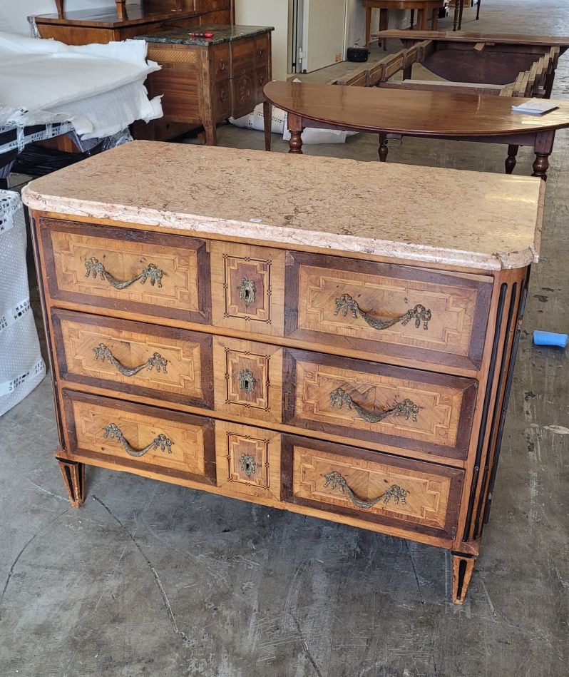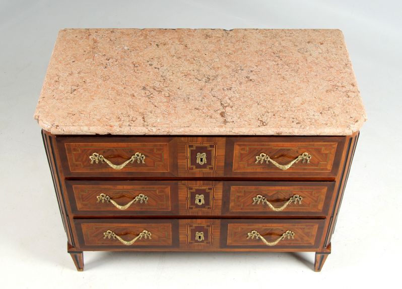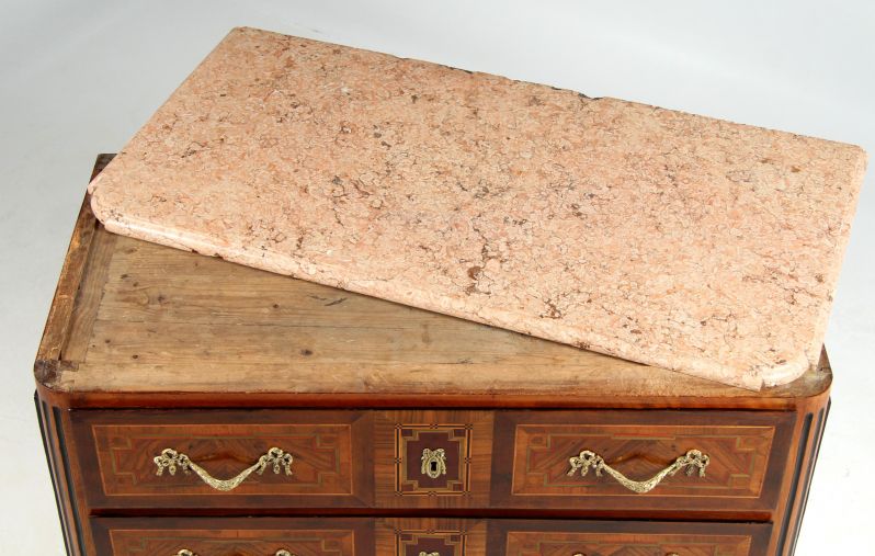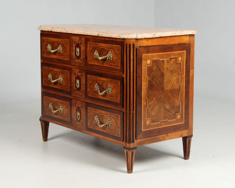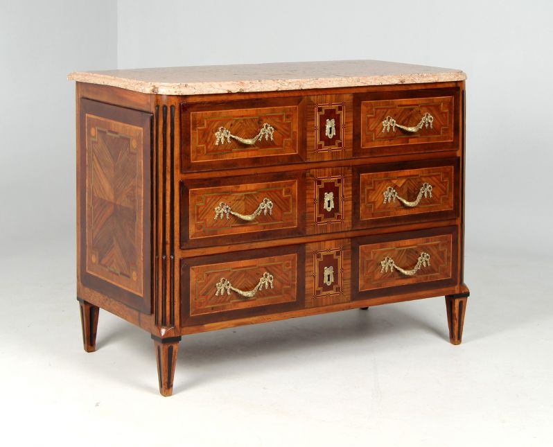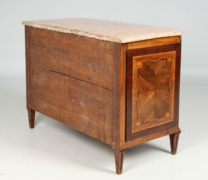 I frontali dei cassetti sono suddivisi in tre pannelli con un'elaborata tecnica di intarsio.