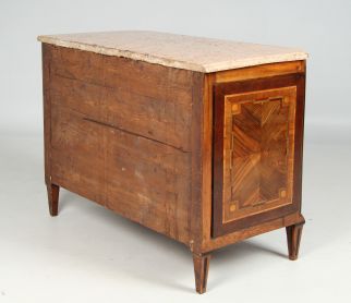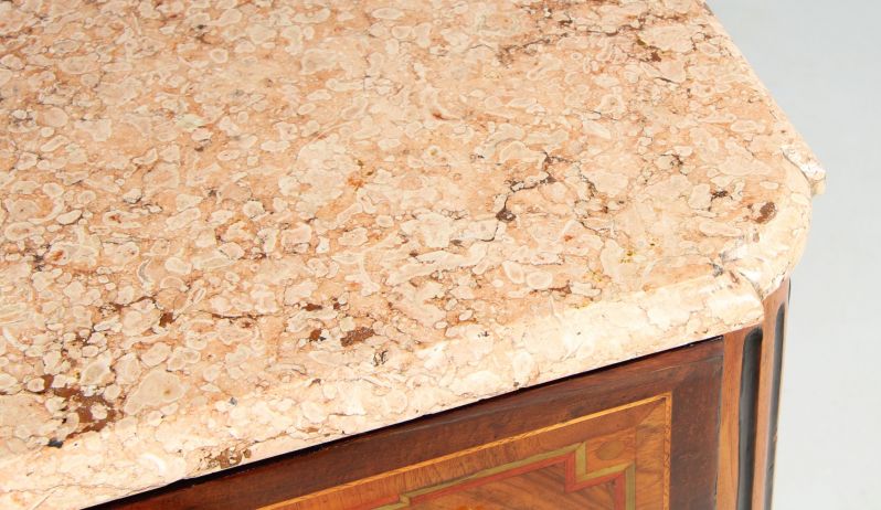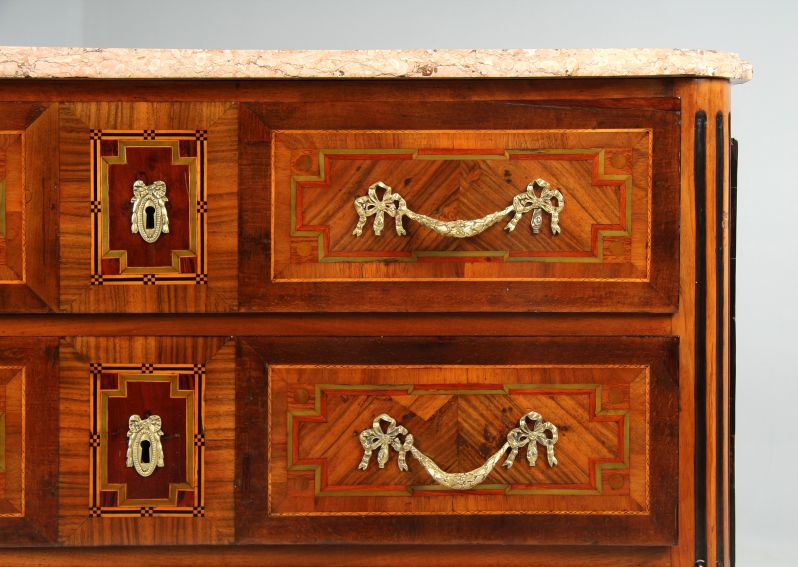 L'intarsio geometrico e i nastri di filetto del mobile qui proposto si inseriscono stilisticamente nel periodo creativo di Jean-François Hache, alla fine del XVIII secolo. Anche gli elementi circolari nei pennacchi angolari dell'incorniciatura sono tipici del suo stile di design.