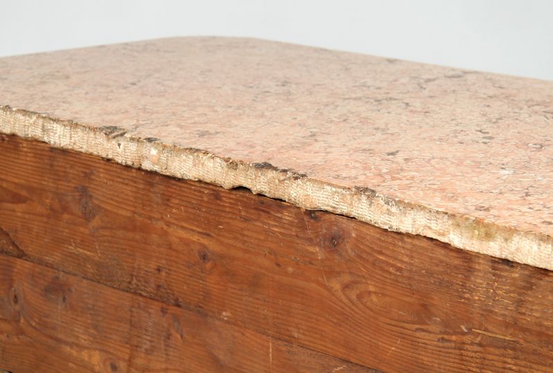 Un pesante piano in marmo rosato chiaro con sottili venature costituisce l'estremità superiore.