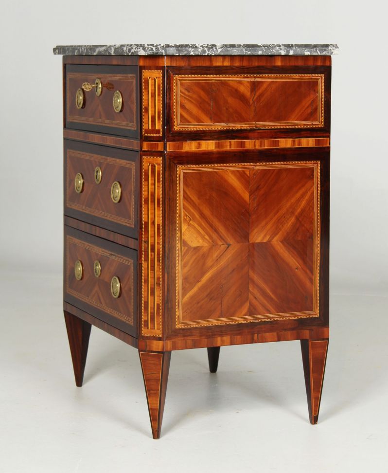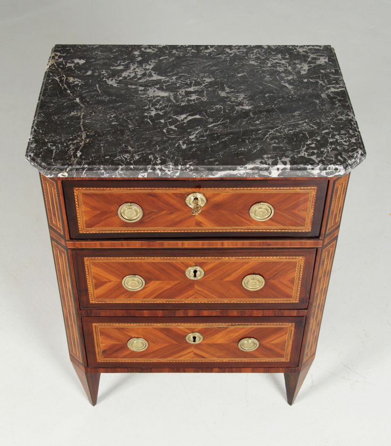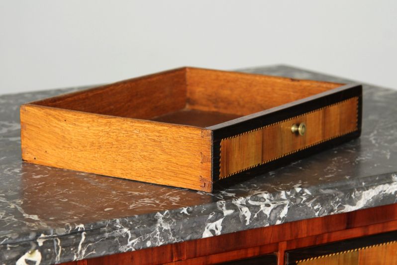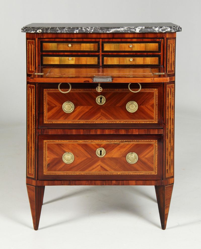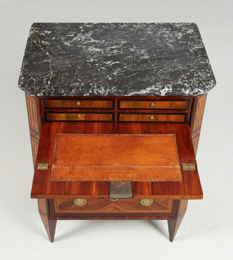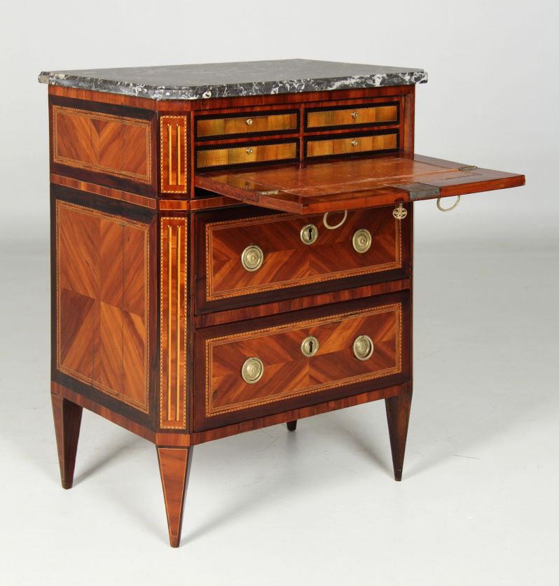 Eccezionale cassettone Luigi XVI di piccole dimensioni con cassetto scrittoio e intarsi di pregio.