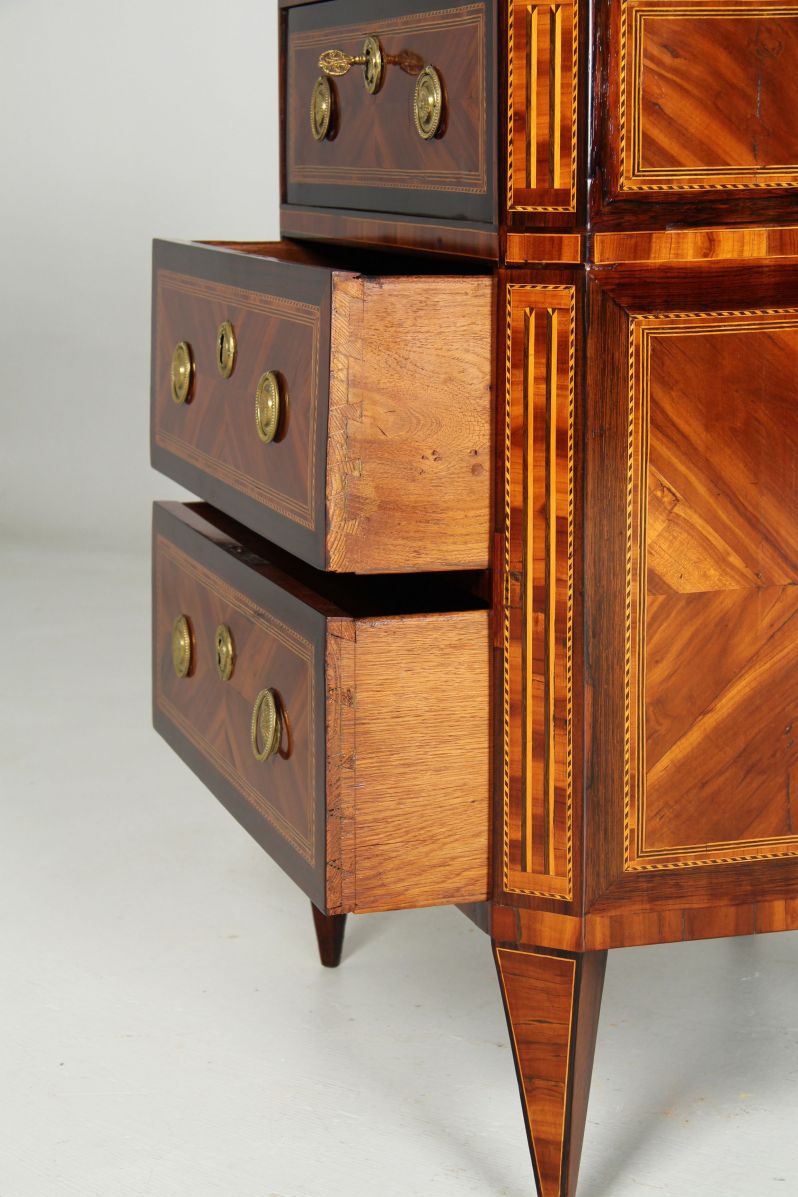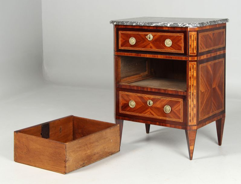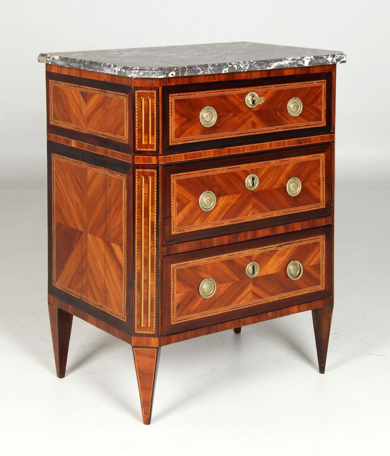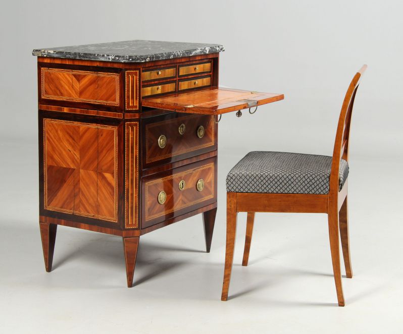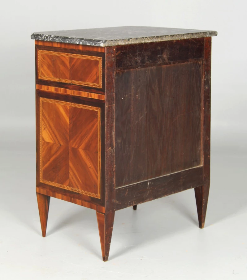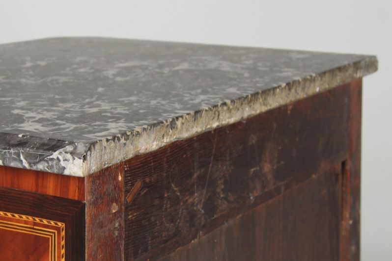 Eccezionale cassettone Luigi XVI di piccole dimensioni con cassetto scrittoio e intarsi di pregio.