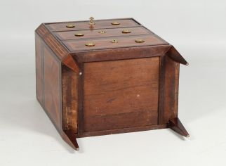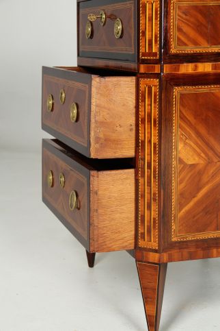 Mobile a tre livelli che poggia su gambe appuntite. I frontali dei cassetti hanno un ampio bordo in legno di mogano scuro. Le superfici incorniciate da fasce di filetto e intarsi a filetto sono impiallacciate in legno di prugna disposto in diagonale. Le lesene inclinate presentano una scanalatura trompe l'oeil in legni chiari e scuri a contrasto.