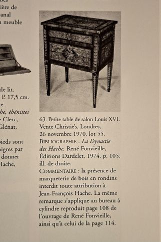 - la classificazione stilistica: i mobili con questa tecnica di impiallacciatura appaiono prevalentemente nel design del periodo Luigi XVI, ma, anche se un po' più raramente, come nel caso del mobile qui proposto in stile Luigi XV. La bottega di Hache, attiva per diverse generazioni, fu attiva proprio in questo periodo. (Thomas Hache 1664-1747, Pierre Hache 1703-1776, Jean-Francois Hache 1730-1796).