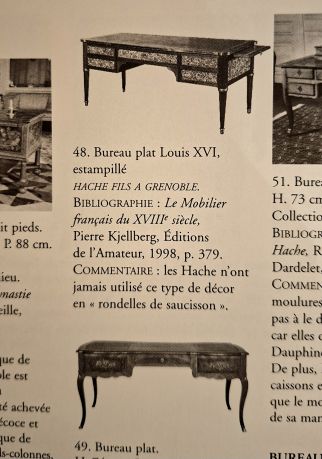 Tuttavia, nel libro di riferimento "Le Génie des Hache" di Pierre e François Rouge, pubblicato nel 2005, l'attribuzione di qualsiasi impiallacciatura di ostrica o di "Rondelles de Saucisson" è espressamente rifiutata. Tuttavia, non viene fornita alcuna giustificazione dettagliata per questo rifiuto. (vedi foto allegate)
