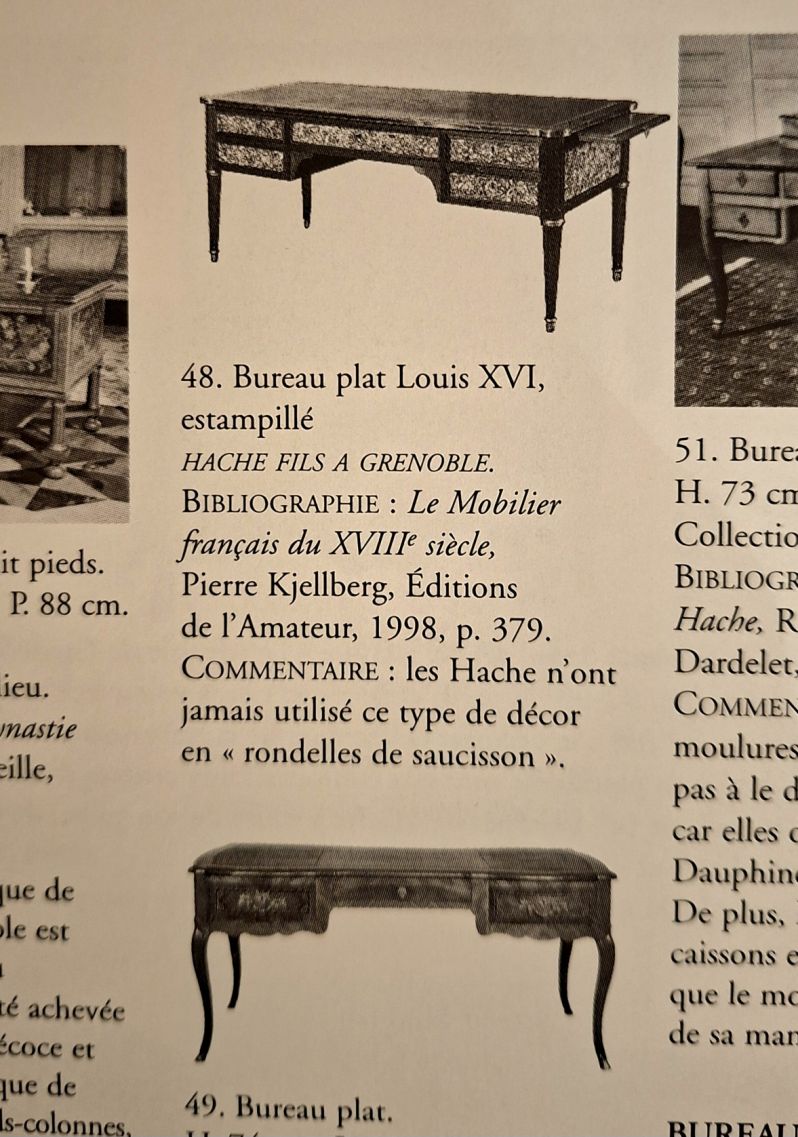In passato, i mobili con questa speciale tecnica di impiallacciatura sono stati ripetutamente attribuiti al laboratorio Hache di Grenoble. René Fonvieille, ad esempio, nella sua opera del 1974 "La Dynastie des Hache" attribuisce a questa bottega diversi pezzi di questo tipo; anche l'opera standard di Pierre Kjellberg "Le Mobilier français du XVIIIe siècle", tuttora molto consultata, elenca una scrivania impiallacciata in questo stile con il timbro Hache.