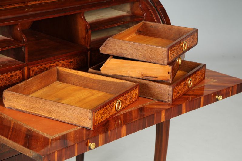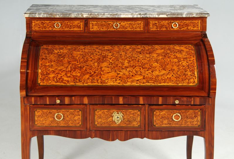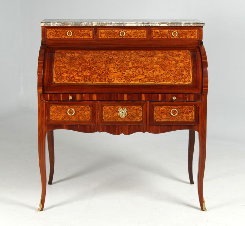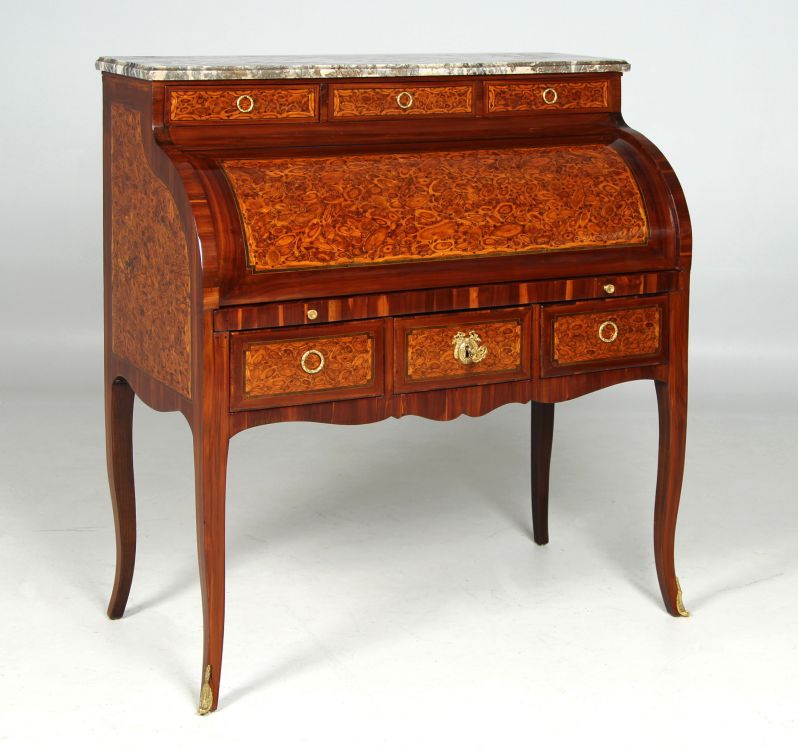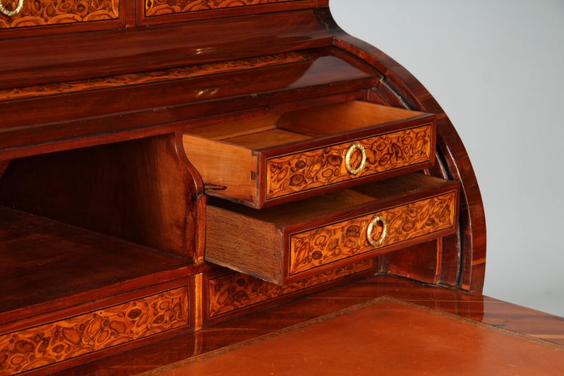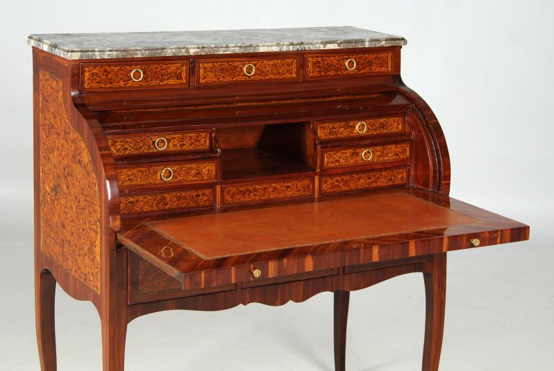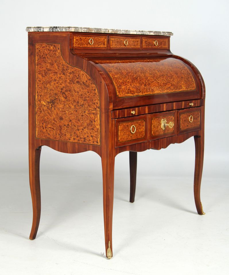 Interessantissimo scrittoio da signora francese, caratterizzato da una notevole tecnica di impiallacciatura e da un ingegnoso sistema di chiusura centrale.