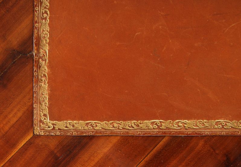 -L'impiallacciatura e la tecnica di colorazione: è certo che la bottega di Hache era nota per la sua disponibilità a sperimentare impiallacciature insolite. Venivano utilizzate radiche e radichette insolite per creare interessanti motivi di superficie. La bottega Hache padroneggiava anche la tecnica della colorazione del legno, particolarmente evidente nei raffinati intarsi a fascia di questo mobile. Un elemento centrale di Haches era la ricerca sistematica dei colori del legno e delle tecniche di colorazione.