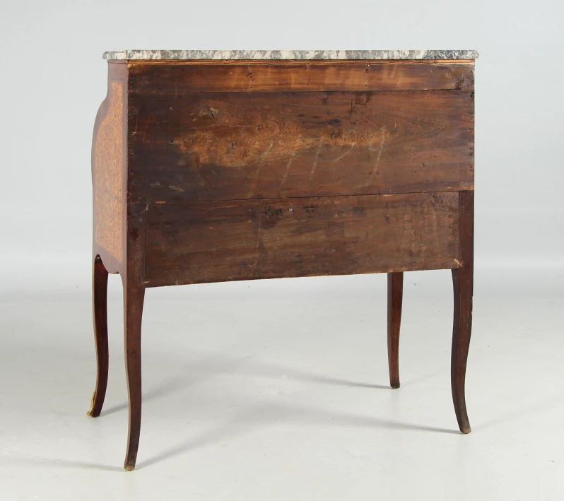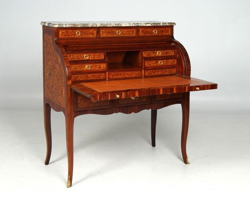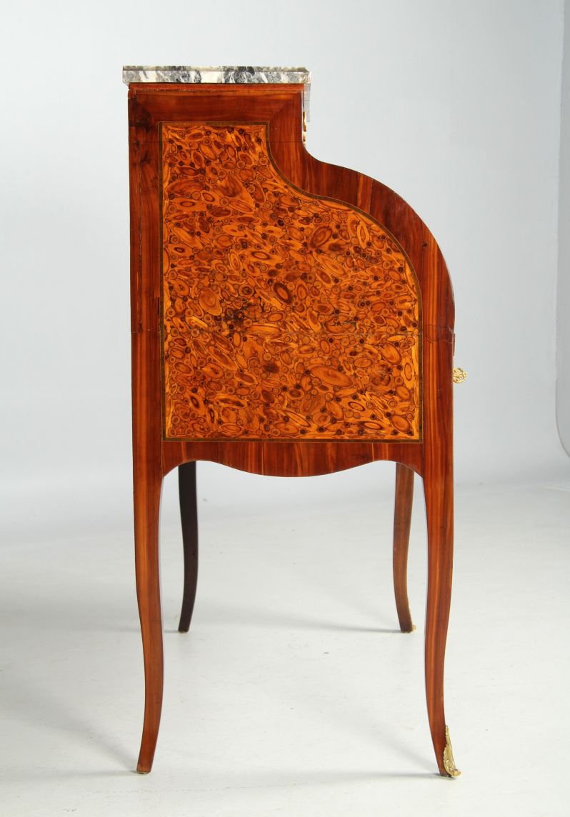 Lo scrittoio, che poggia su gambe leggermente svasate con terminali in ottone nella parte anteriore, ha una serratura a cilindro, una struttura curva e un piano in marmo sciolto. Tre cassetti affiancati si trovano sia sopra che sotto il vano scrittura.