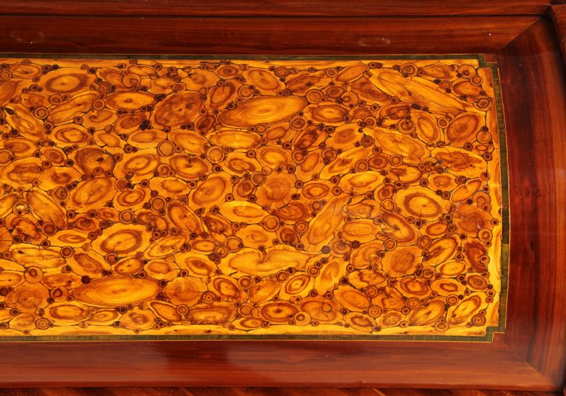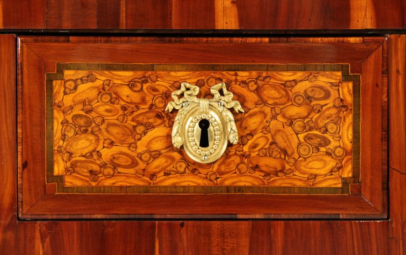 I bordi e le superfici periferiche del mobile sono impiallacciati in legno di prugna, ma l'attenzione si concentra soprattutto sulle superfici in cosiddetta impiallacciatura di ostrica, incorniciate da intarsi a fili sottili. I nodi incrociati, cioè quelli disposti nella venatura finale, sono qui uniti in un disegno selvaggio e disorganizzato.