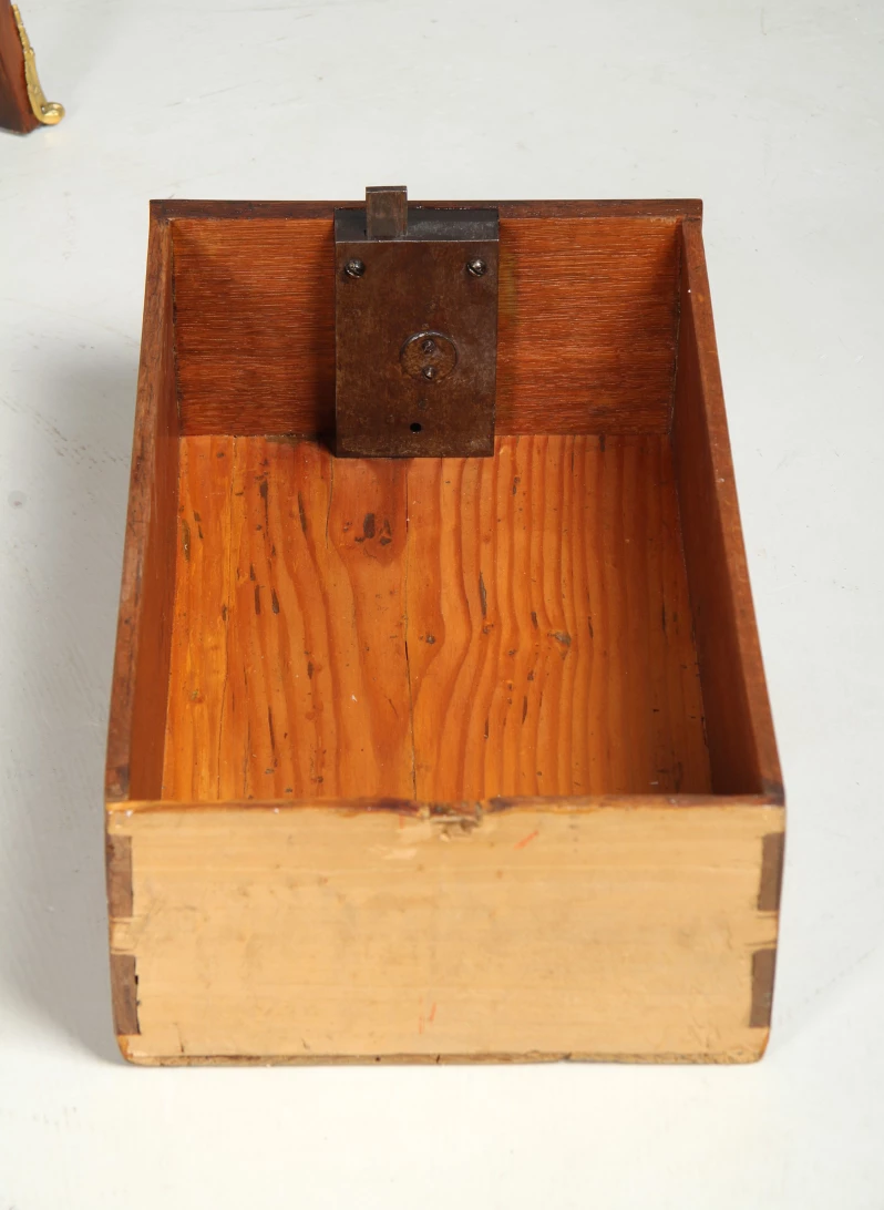 Colpisce la presenza di una sola serratura, ma tutti i cassetti e la serratura a cilindro sono chiusi a chiave. Il chiavistello della serratura chiude anche il piano di scrittura e un ingegnoso sistema blocca tutti gli altri cassetti. (vedi video allegato)