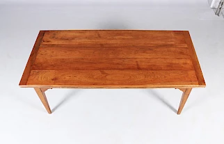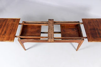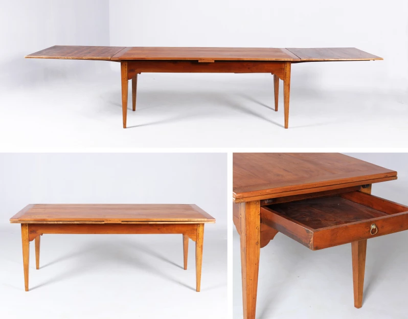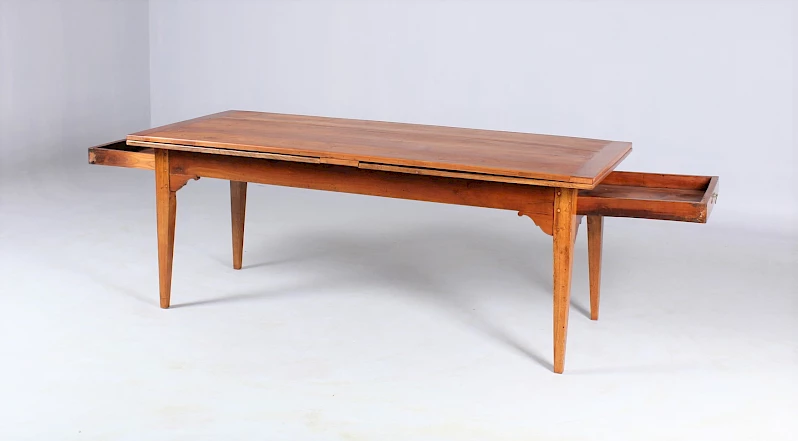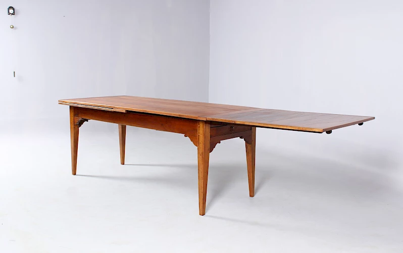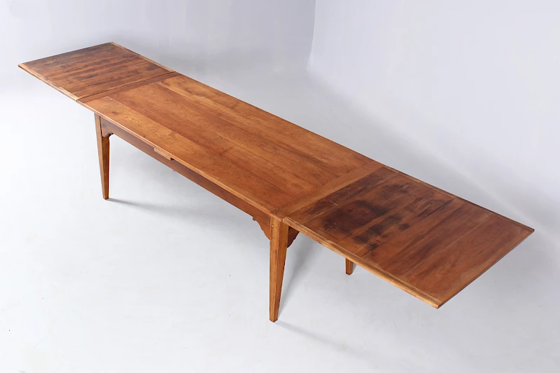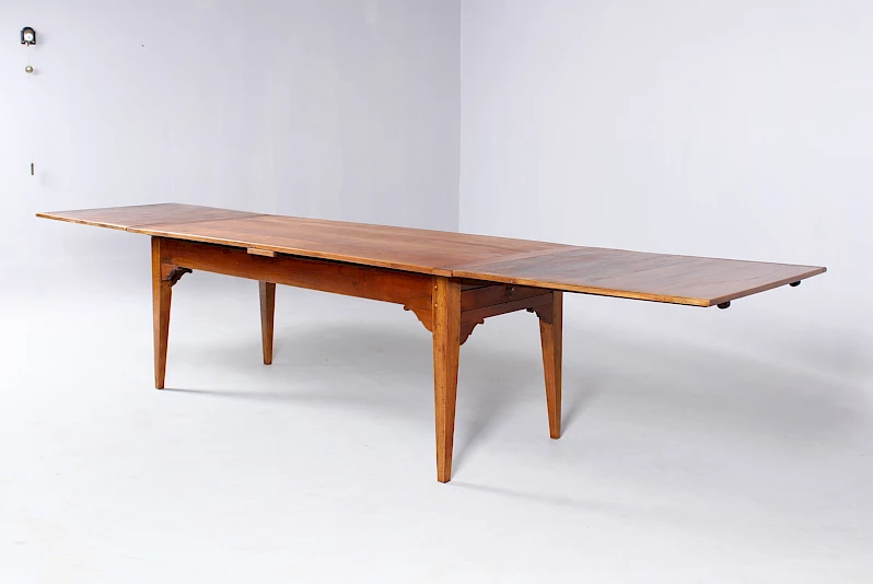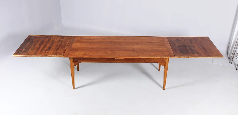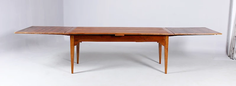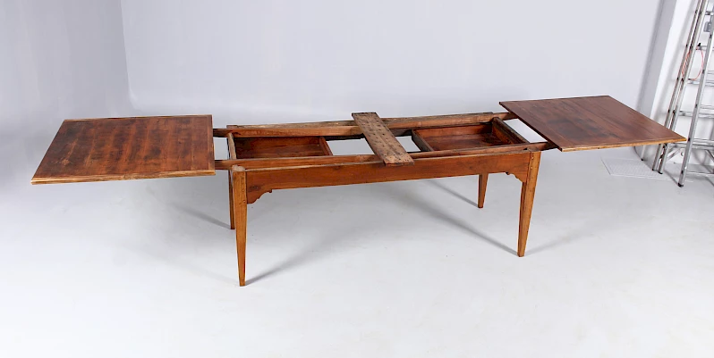 Due prolunghe in legno di ciliegio con una patina in parte abbastanza resistente allungano il tavolo fino a un totale di 384 cm. Entrambe le estensioni possono essere utilizzate anche separatamente. Vedi foto. Le prolunghe sono stabili e adatte all'uso quotidiano.